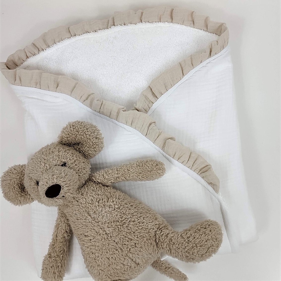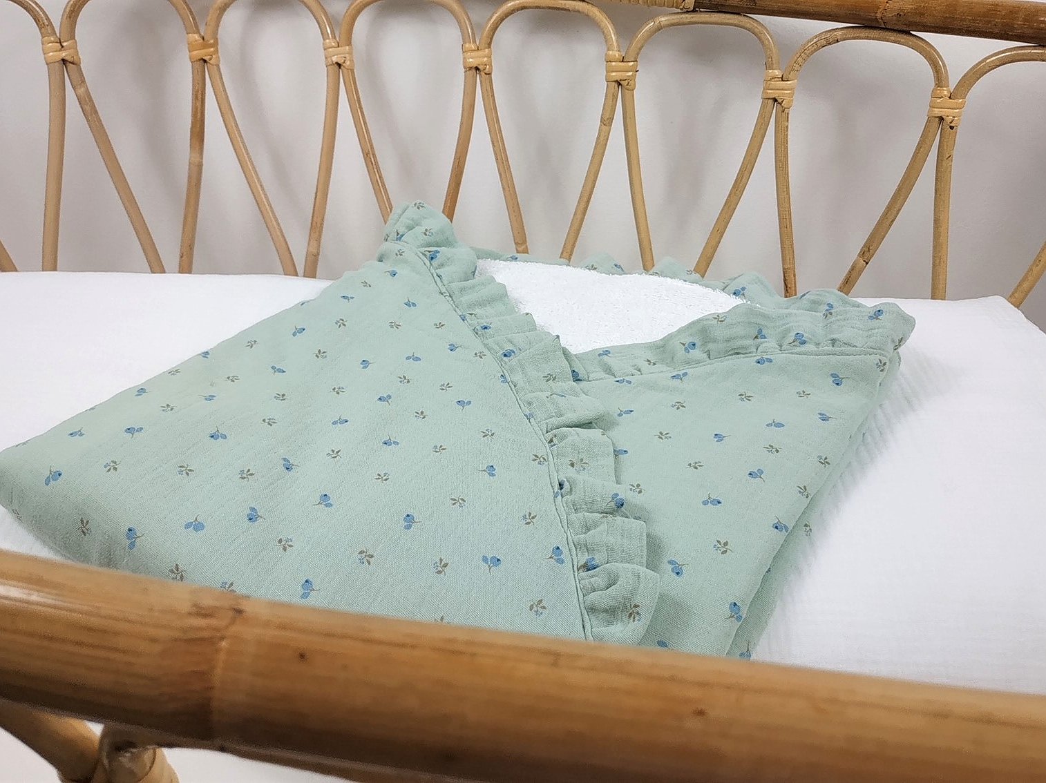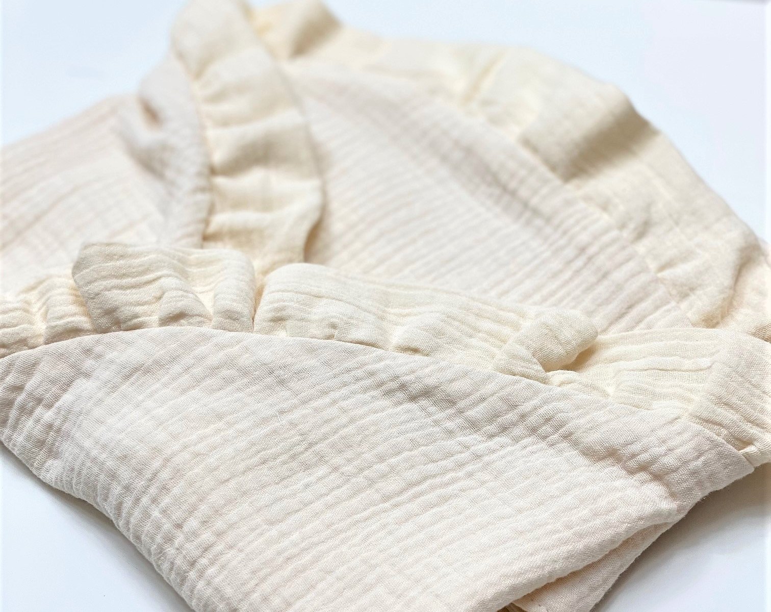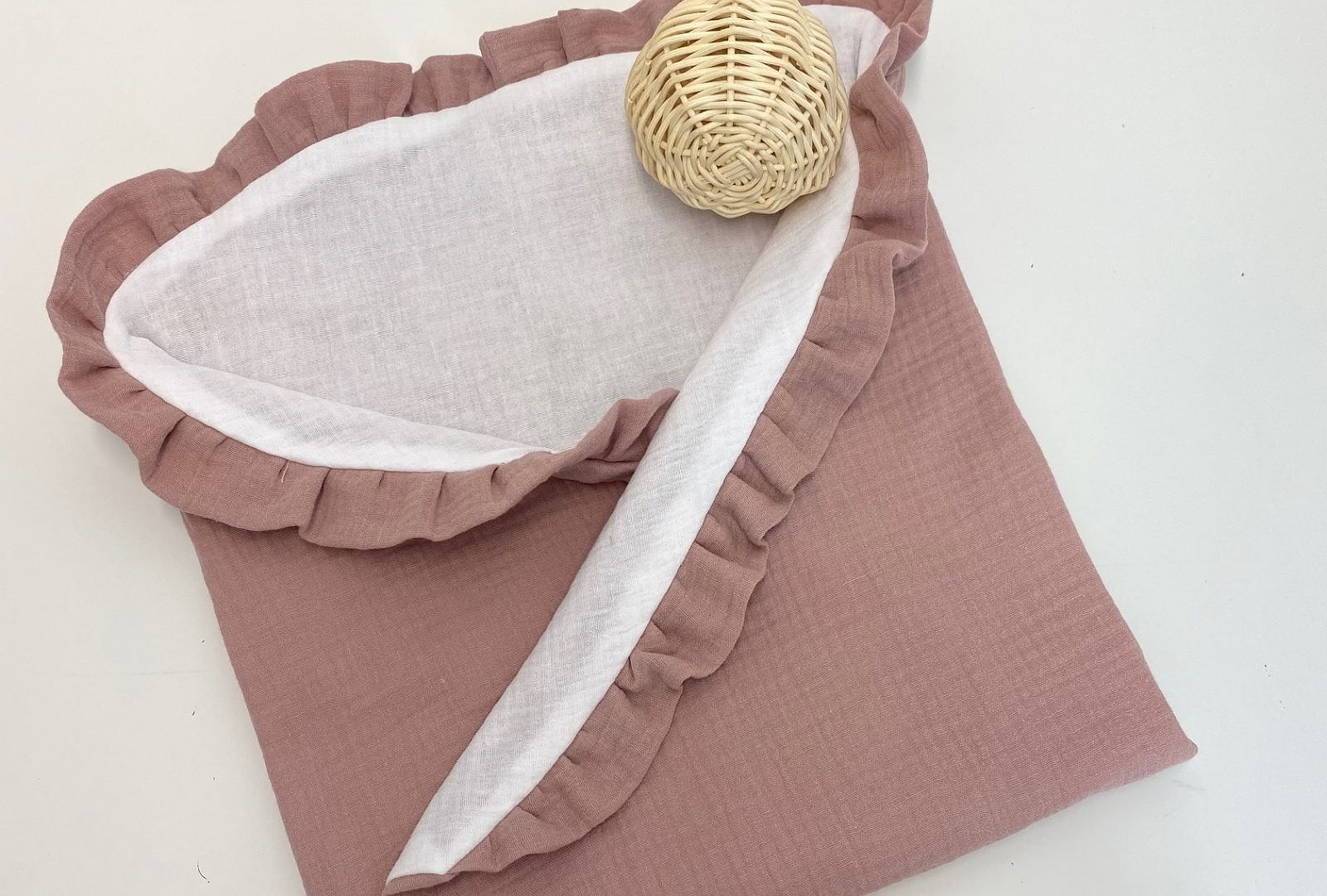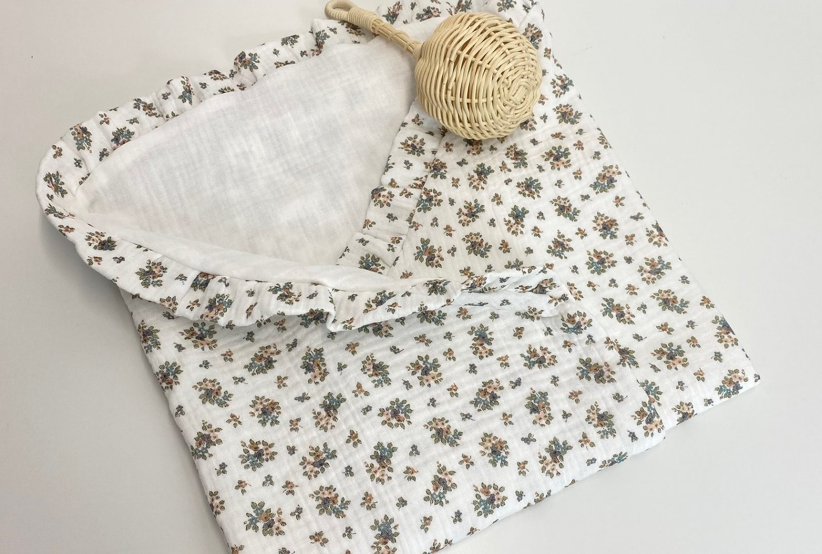 Arrullo de muselina con volante perfecto para la clínica y para usarlo posteriormente para tapar al bebé y mantener así su calor corporal. \n