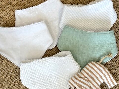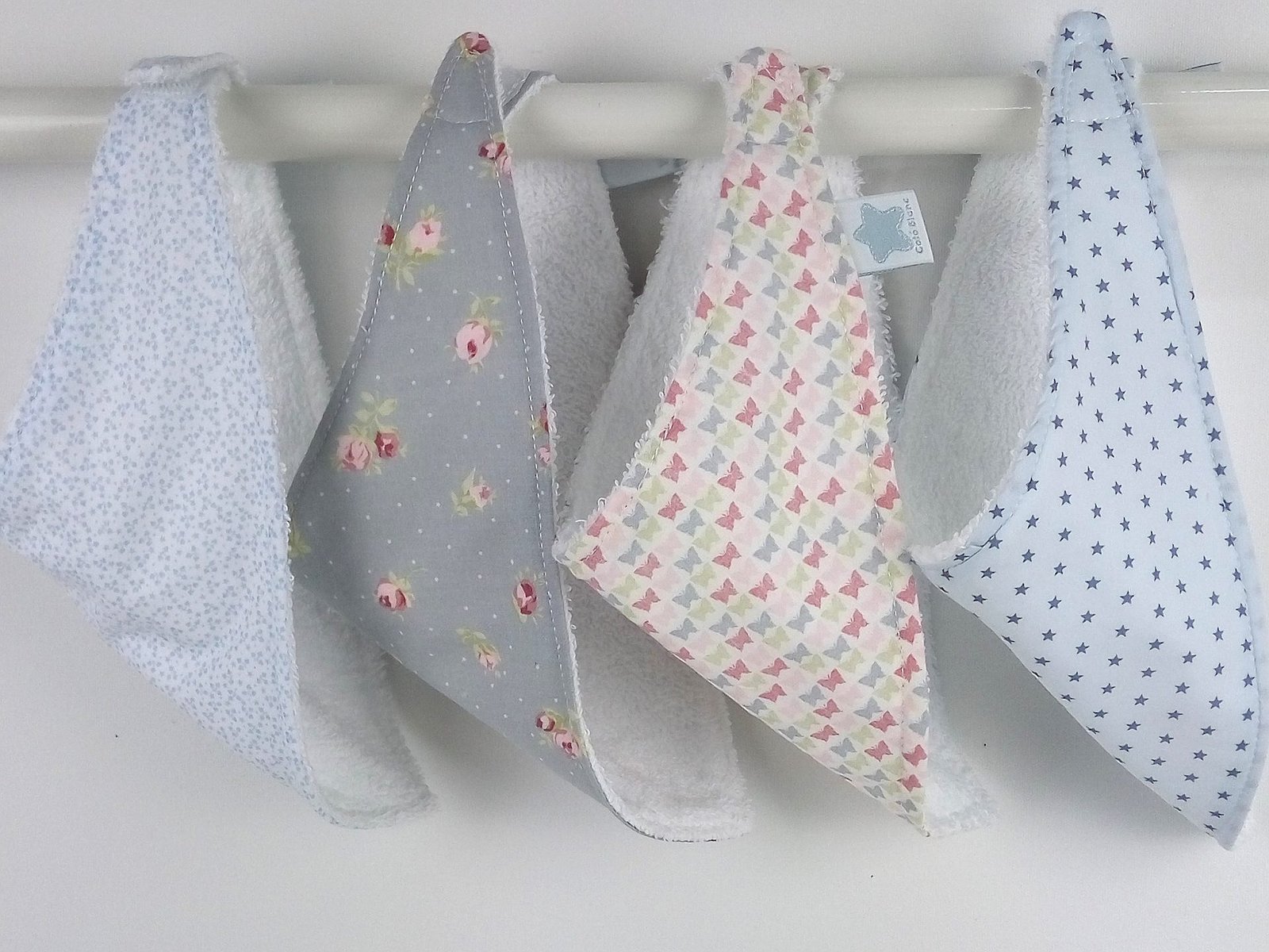 Babero bandana bebé está confeccionado, por una cara con rizo blanco 100% algodón, y por la otra con una tela estampada suave.