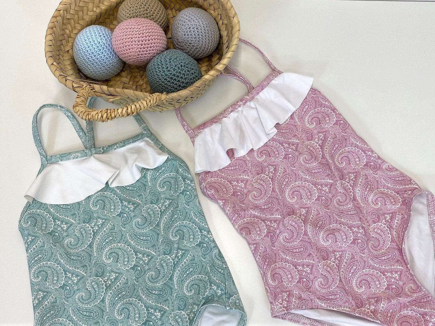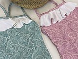 \nBañador niña cashmir rosa o verde con volante blanco en la parte frontal y con tirantes finos.