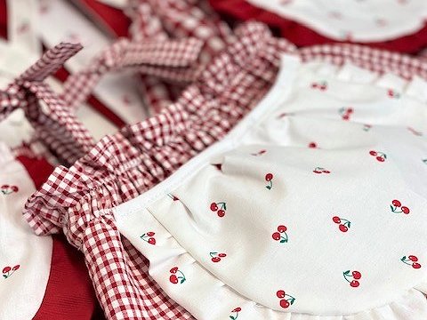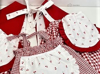 Además tiene una capa con capucha de tejido doble. Por un lado las cerezas y por el otro de color rojo. El disfraz perfecto para carnaval y para que tu pequeña vaya ideal.