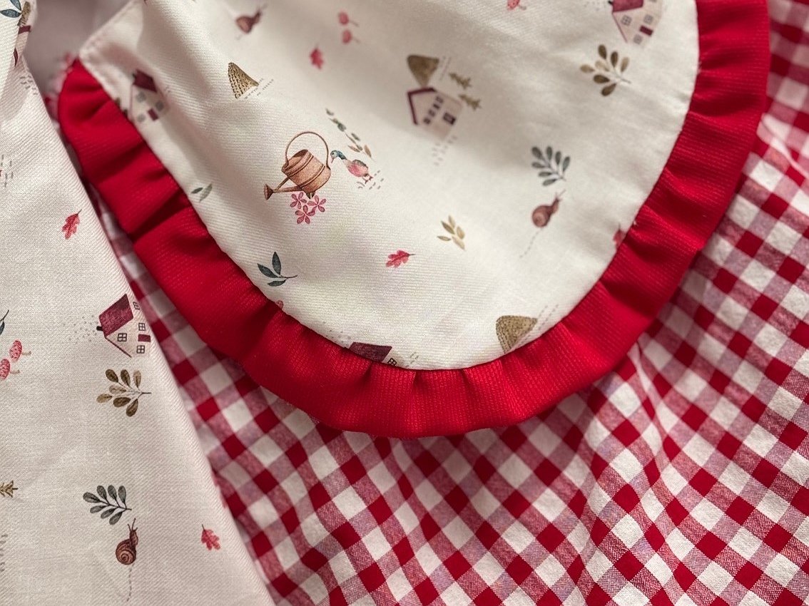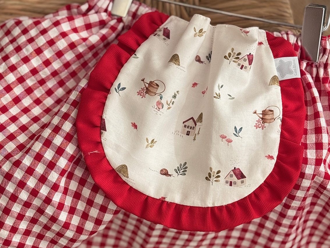 Disfraz caperucita roja para niña, compuesto por la falda con delantal unido por dos costuras para que no se caiga y se más cómodo para la niña.