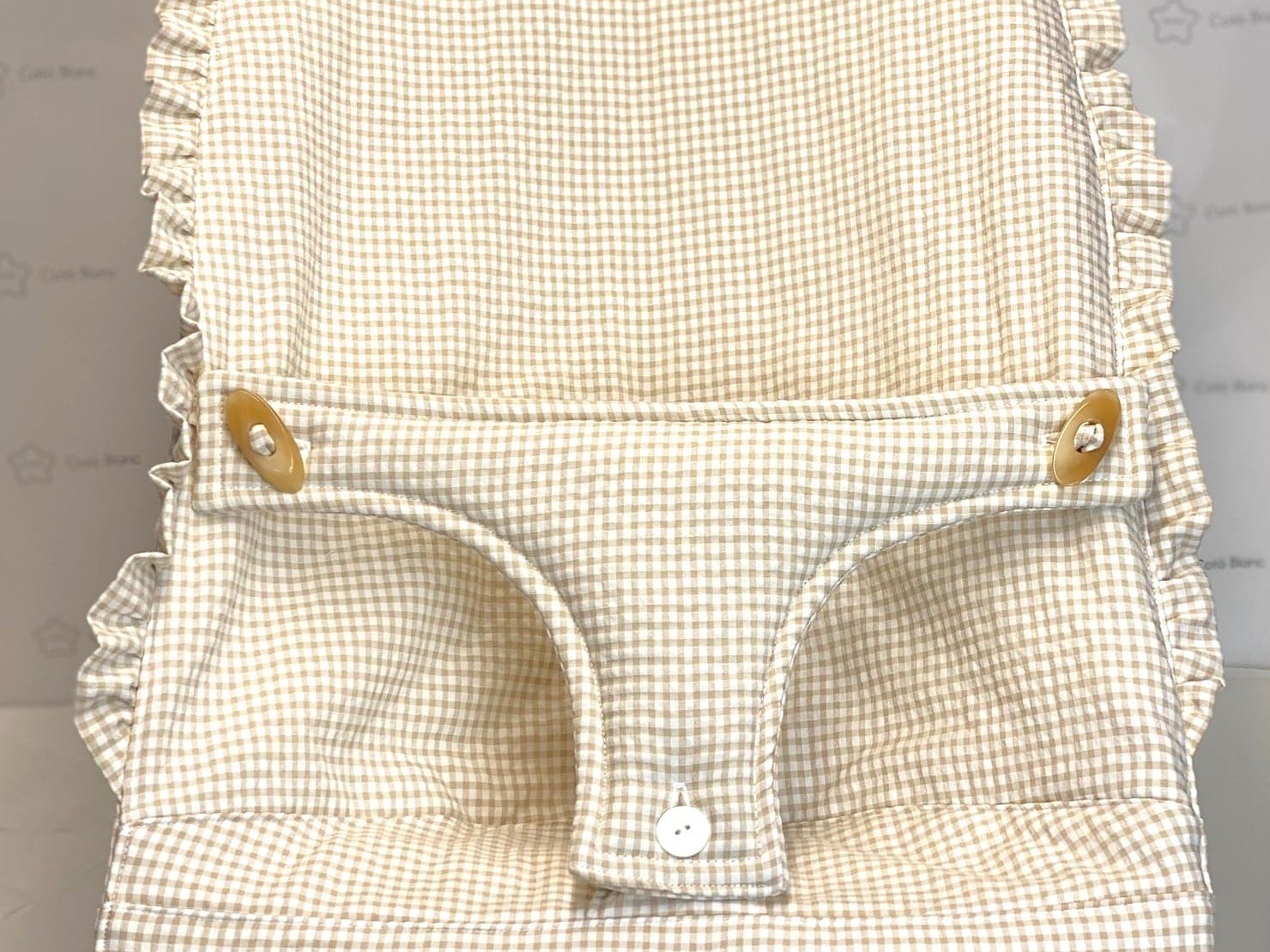 Funda hamaca Babybjorn reversible con volante combina dos tejidos que más te gusten y te la confeccionamos. Para colocar en vez de la funda original.