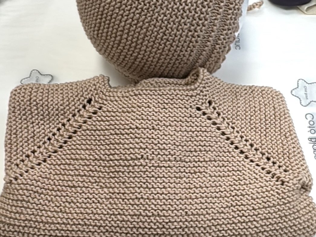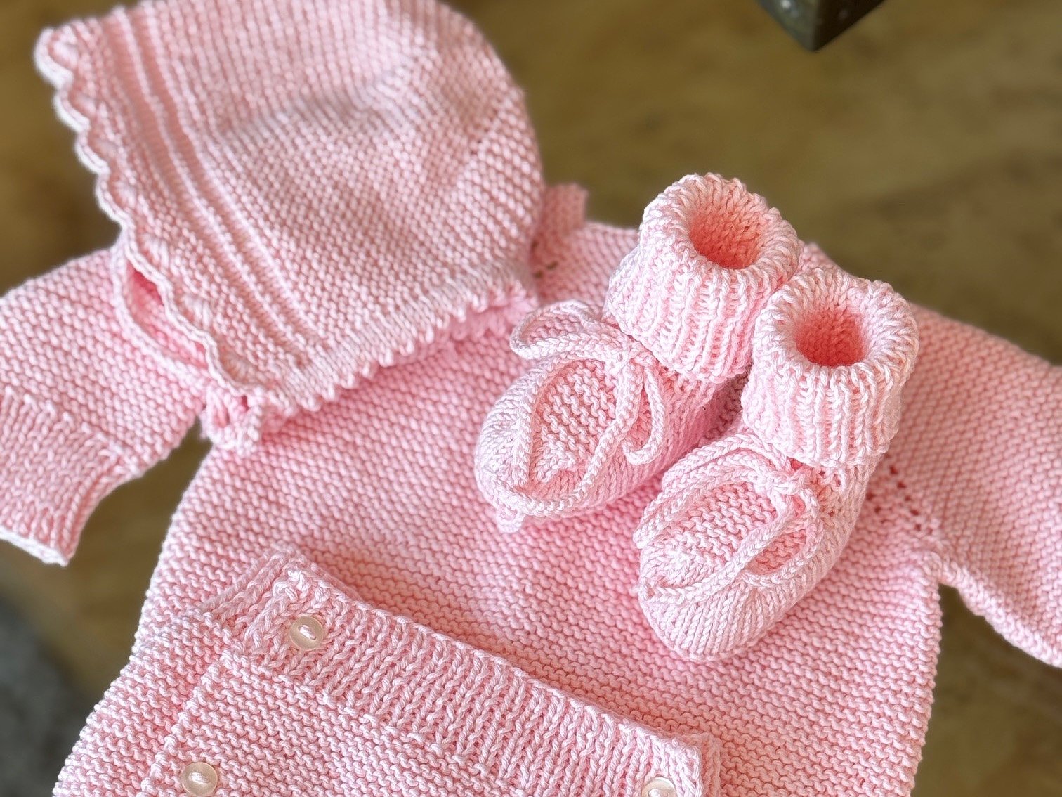 Puedes completar el look con Peucos hechos a mano en punto de algodón y con la Capota bebé de punto a mano