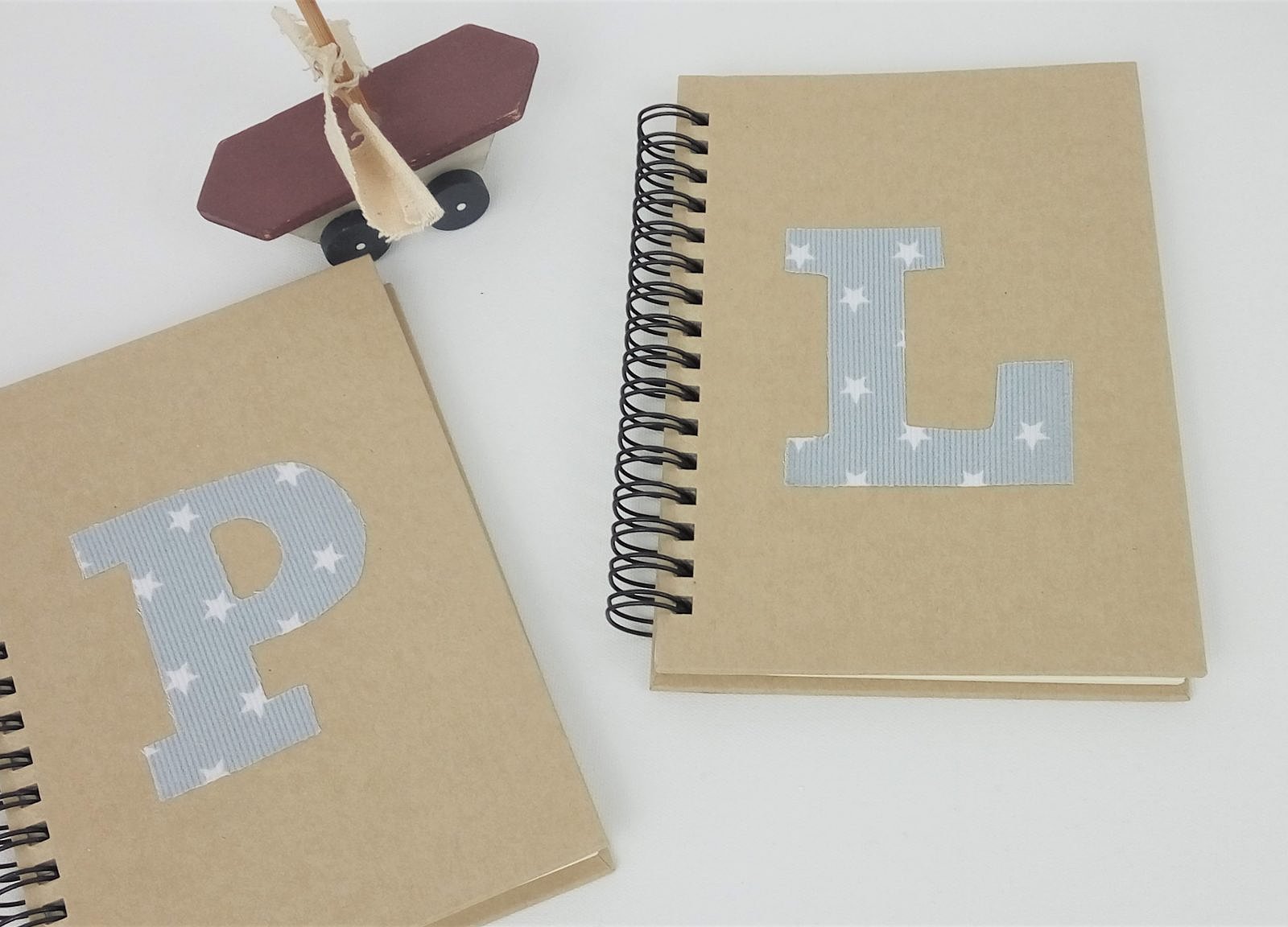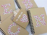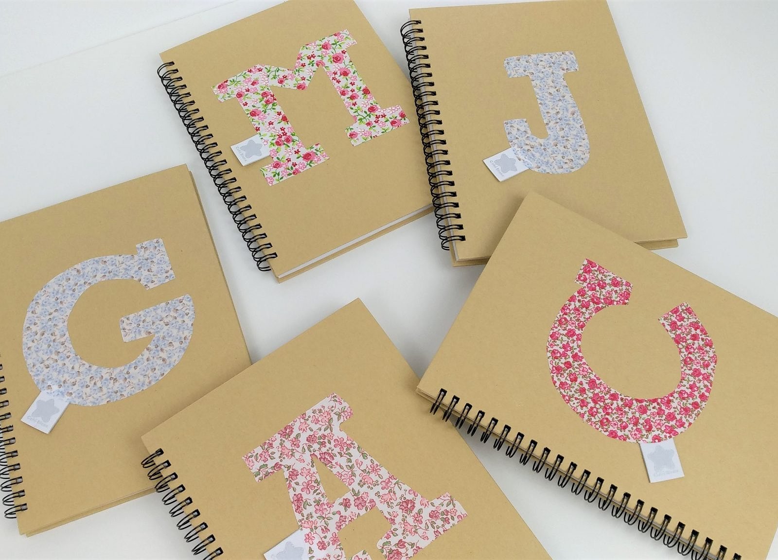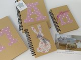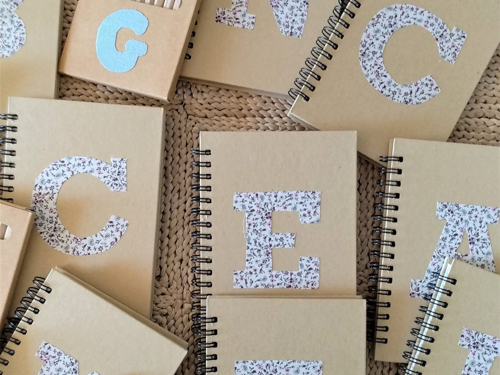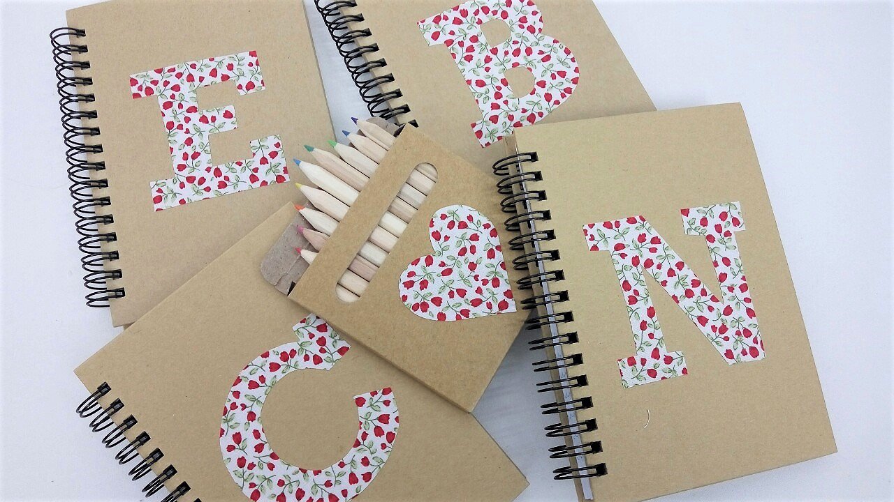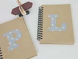 Libreta personalizada con inicial . Todas ellas son con tapa dura de cartón y espiral, en su interior las hojas llevan rayas horizontales.