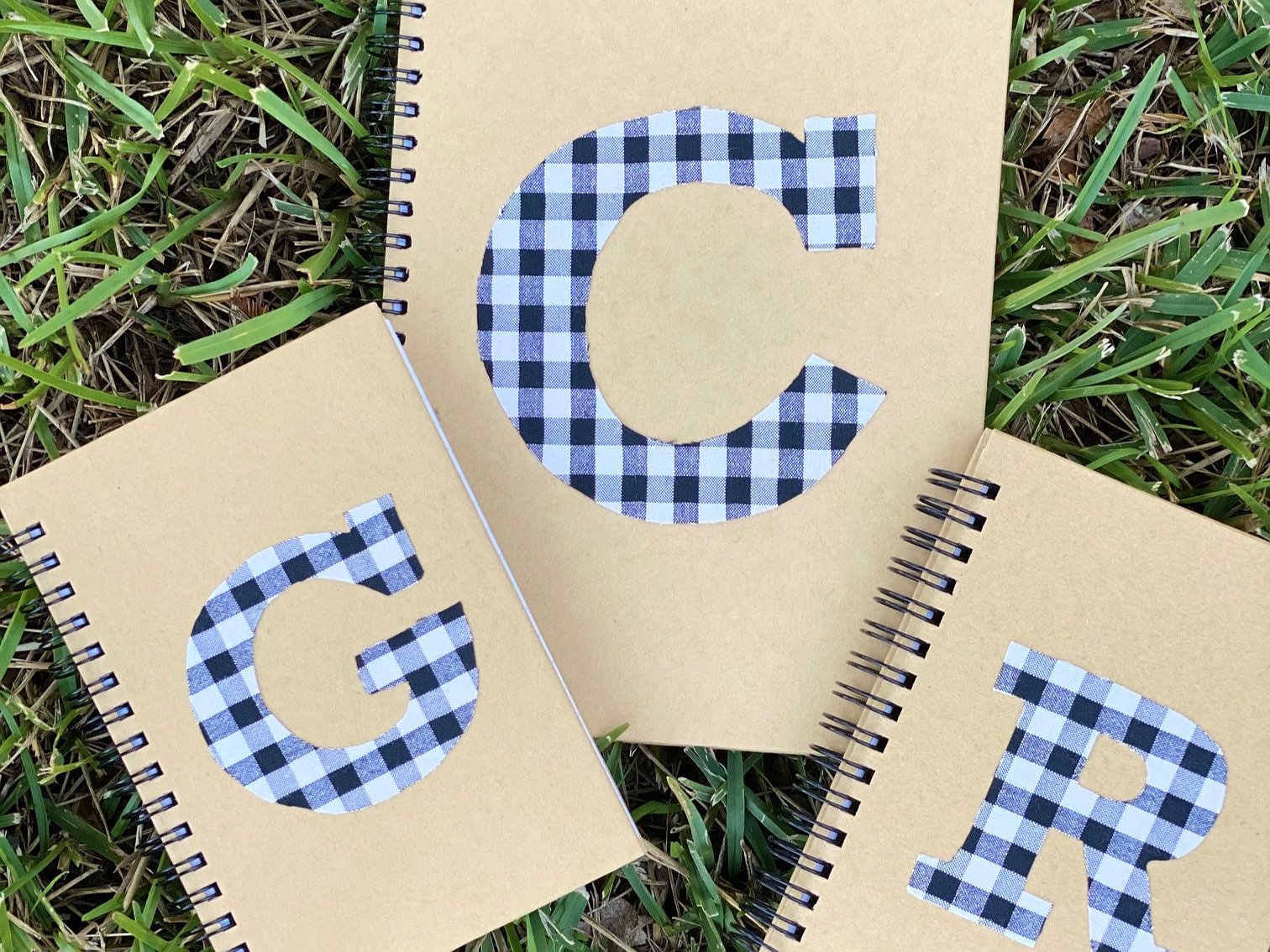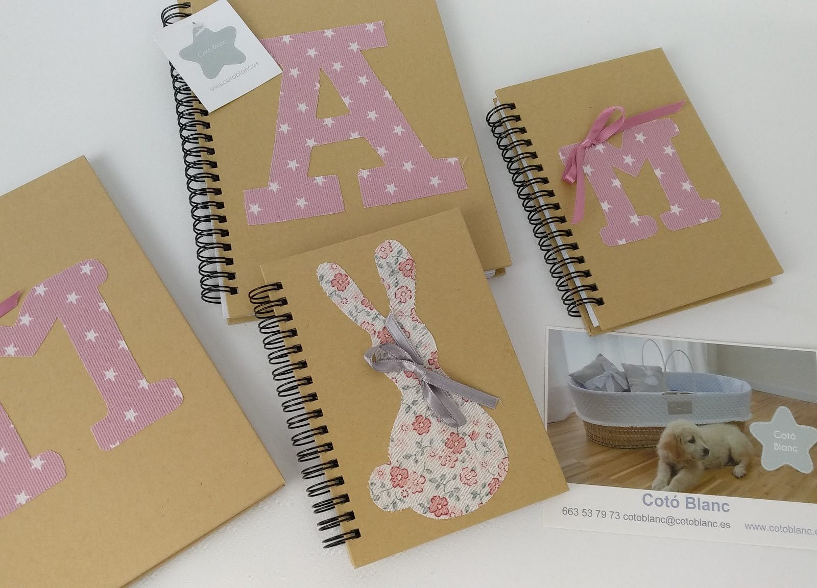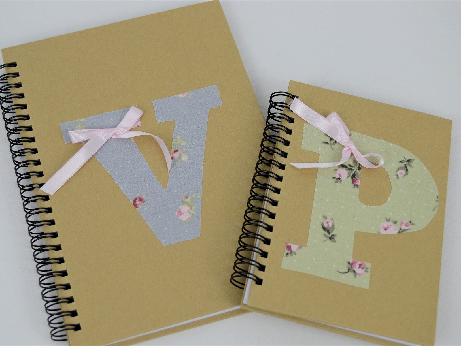 Libreta personalizada con inicial . Todas ellas son con tapa dura de cartón y espiral, en su interior las hojas llevan rayas horizontales.