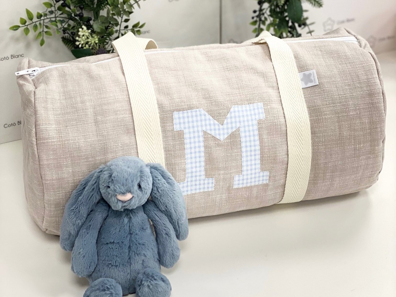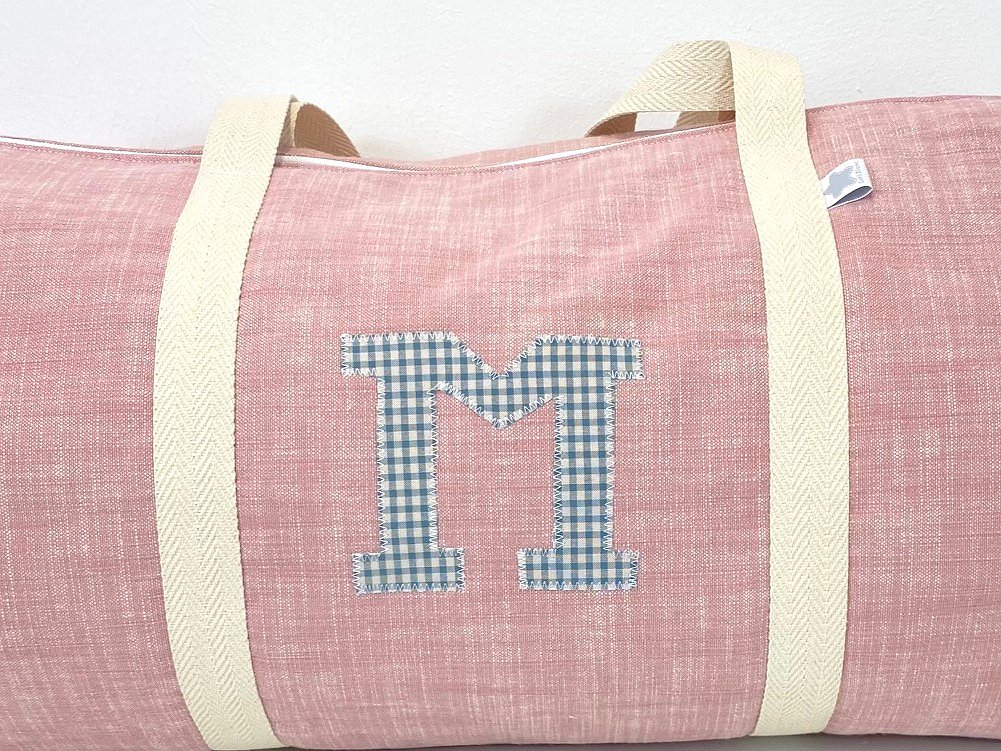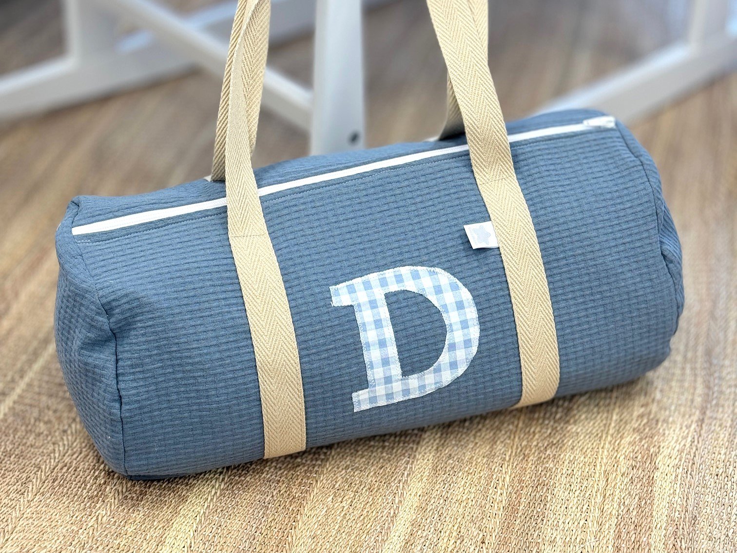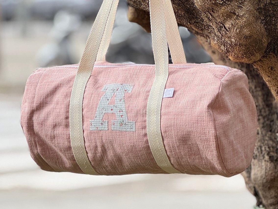 Macuto extraescolar con inicial o detalle aplicado, personalizado con la tela que más te guste acolchada y con asas de mano para coger.