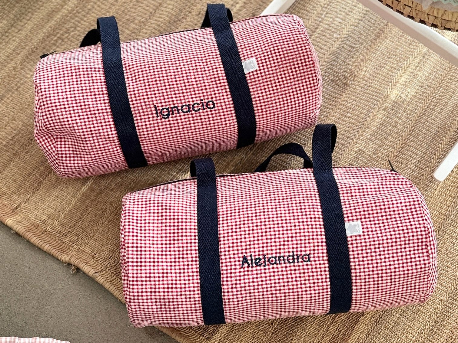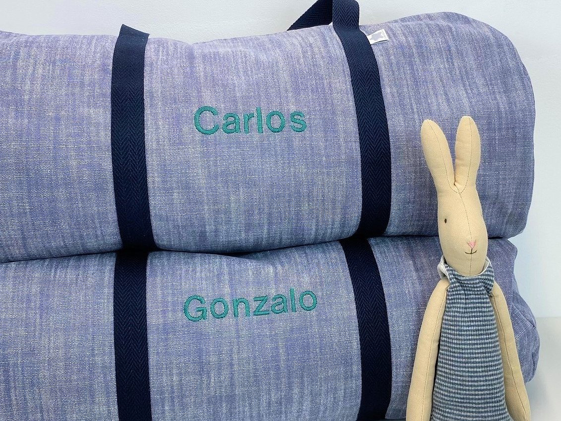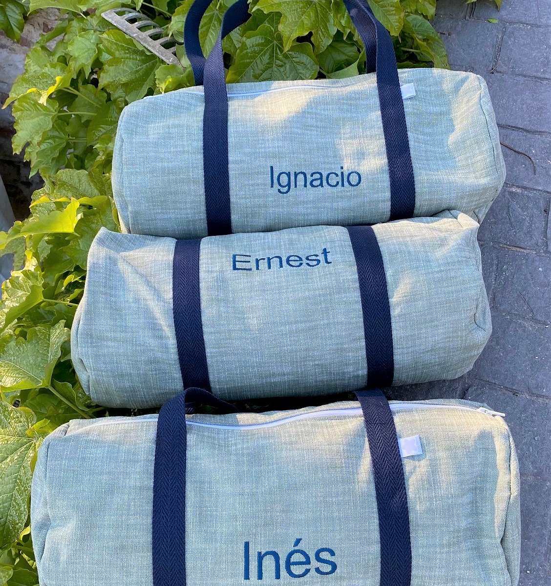 Macuto extraescolar con nombre bordado a máquina personalizado con la tela que más te guste, acolchado y con asas de mano para coger.