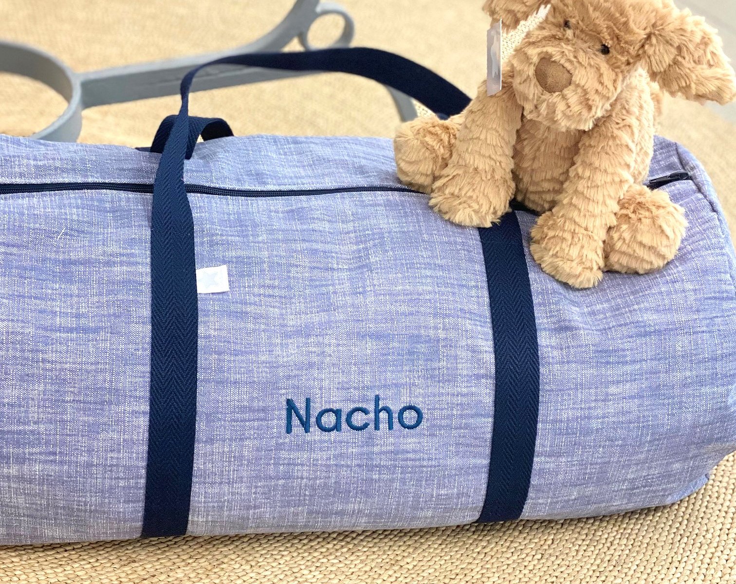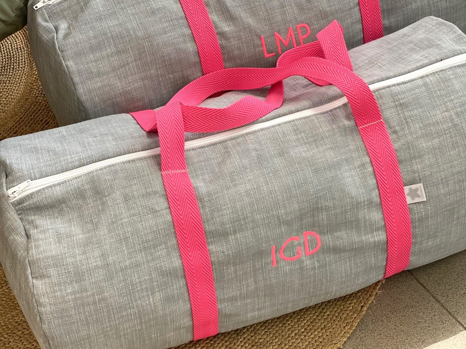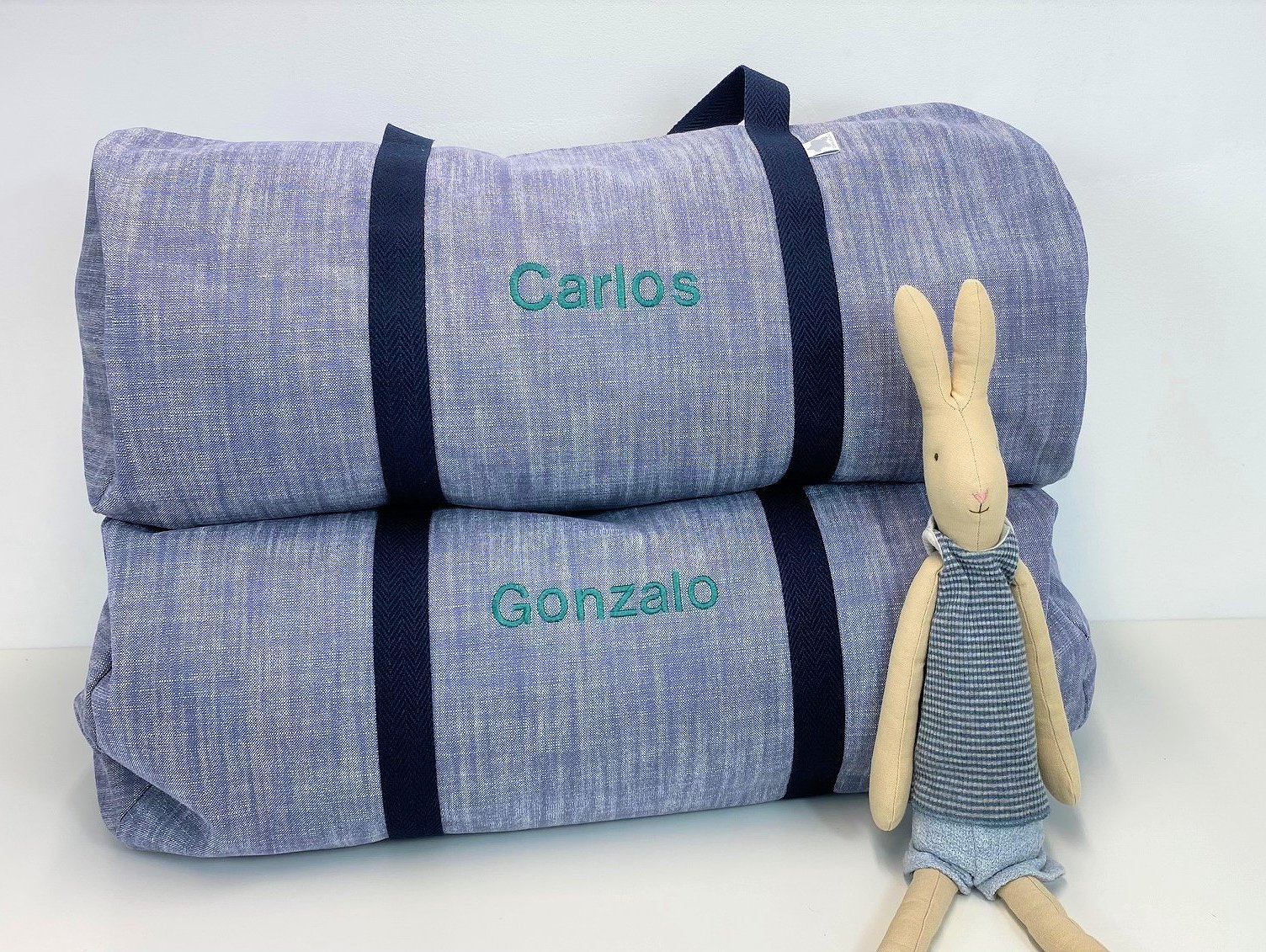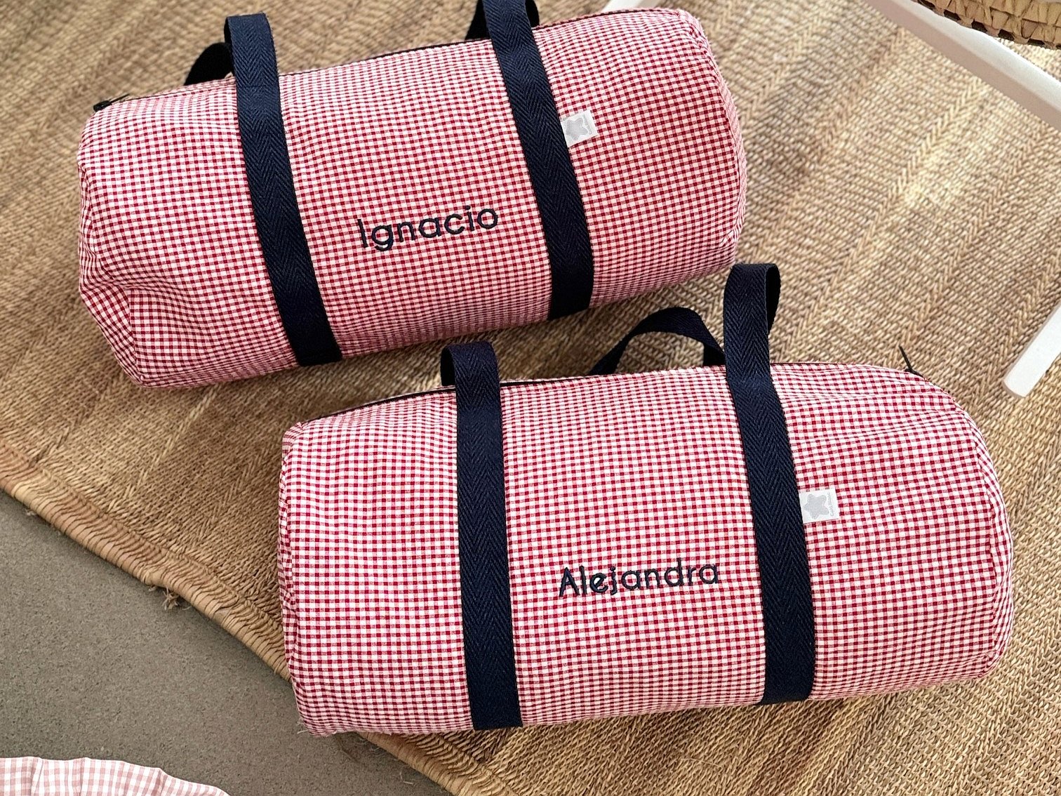 Macuto weekend con nombre bordado a máquina personalizado con la tela que más te guste acolchada y con asas de mano para coger.
