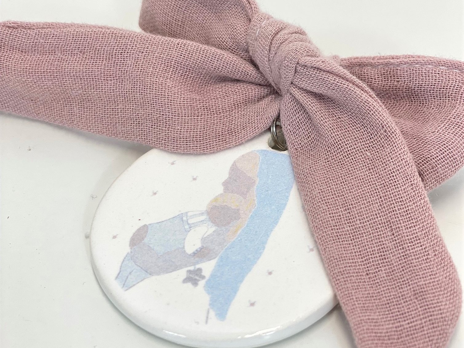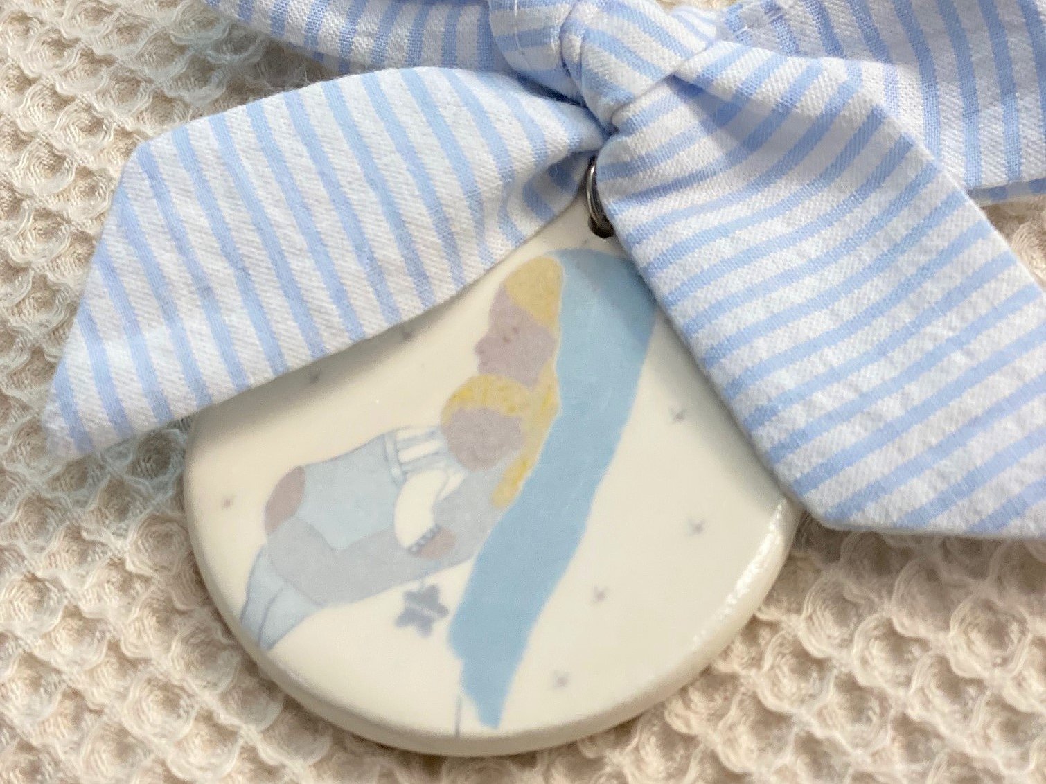 Medalla para cuna o capazo en cerámica virgen Azul , exclusivo diseño de Cotó Blanc, realizada artesanalmente.