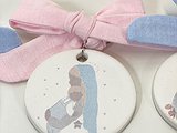 Hecha en cerámica de unos 5 cm de diámetro, con dibujo exclusivo de la virgen con un mini cliente Cotó en brazos.