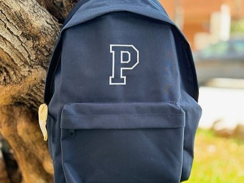 Mochila colegial PLUS pequeña con inicial oxfort bordada, en poliéster. Disponible en cuatro colores, para que lleven sus libros al colegio.