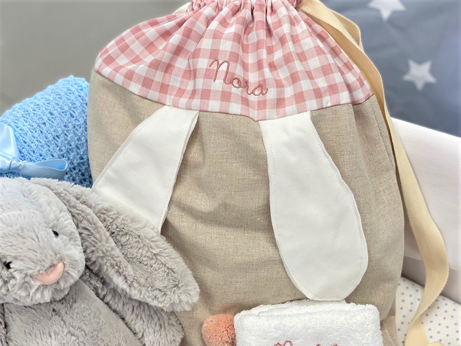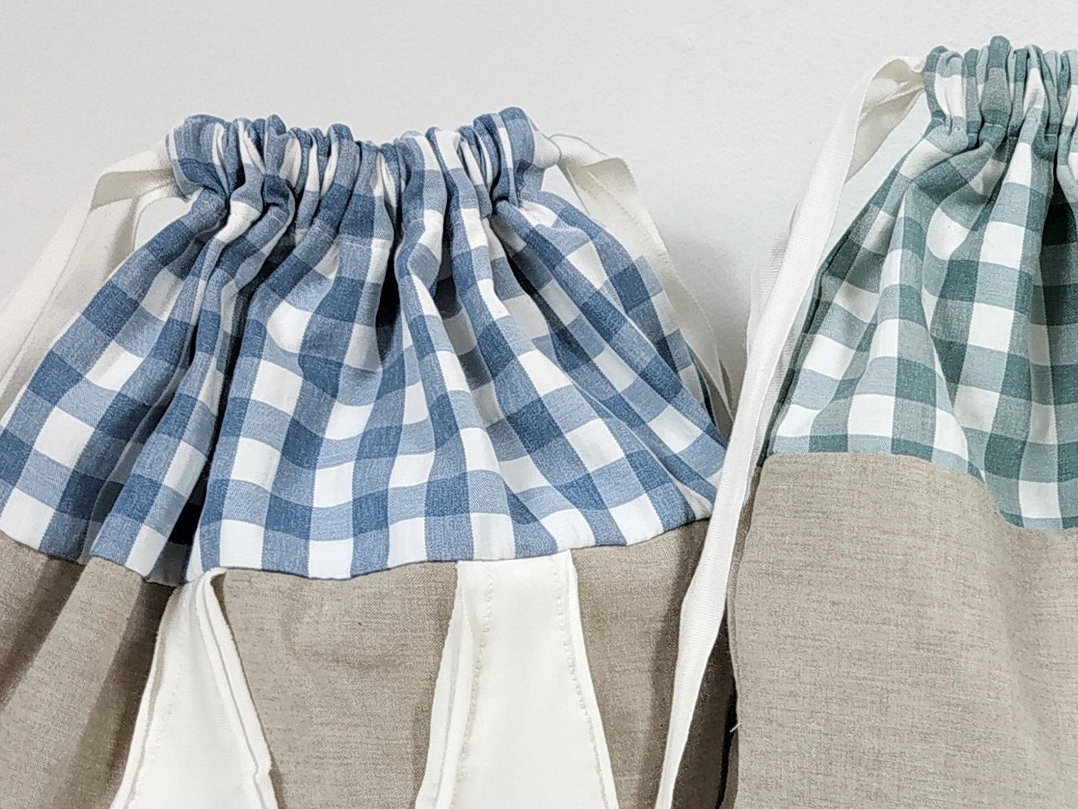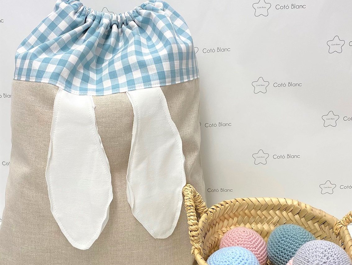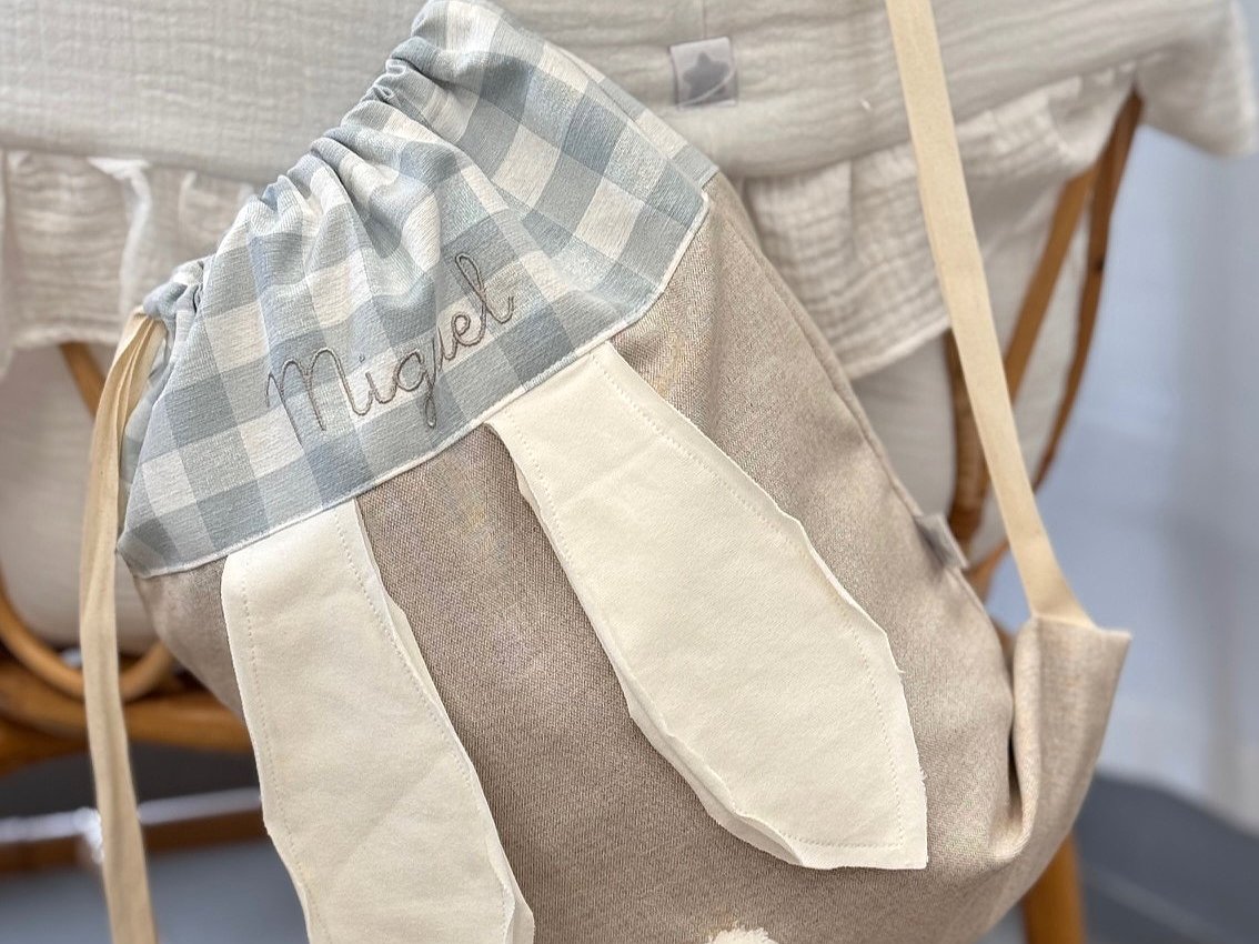 Mochila ligera de tela con orejitas la base es en color lino natural y combinada con vichy rosa, verde, azul , para otras telas consúltanos.