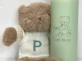 Osito con jersey personalizado con inicial bordada. Se trata de un osito de peluche en color beige o en blanco muy suave.