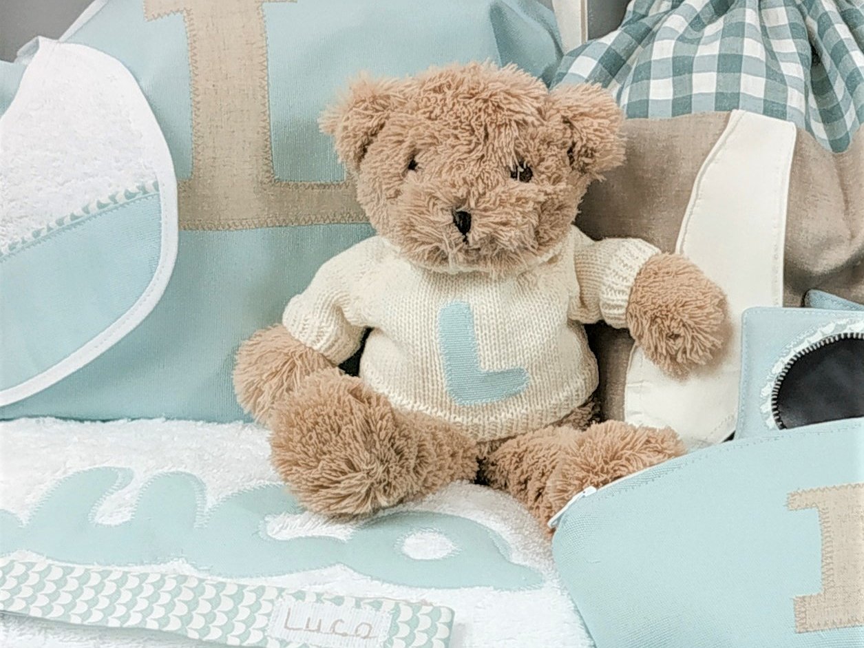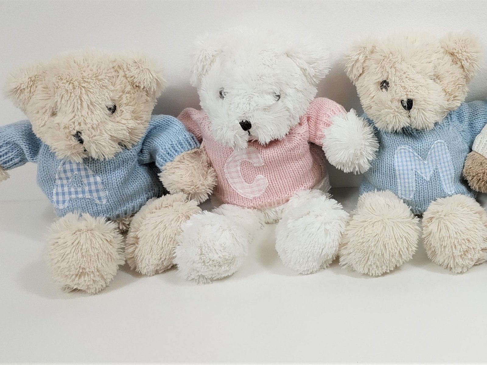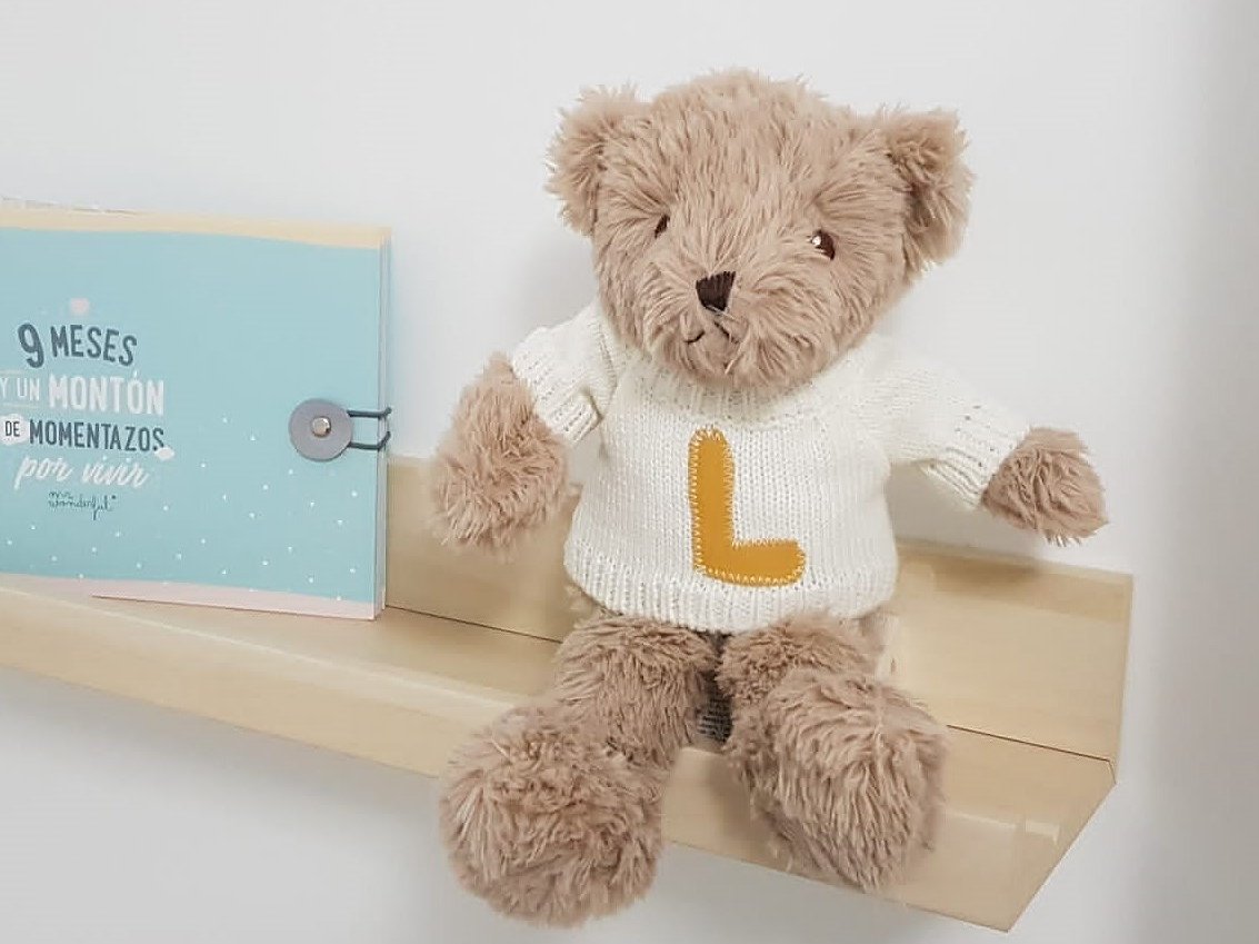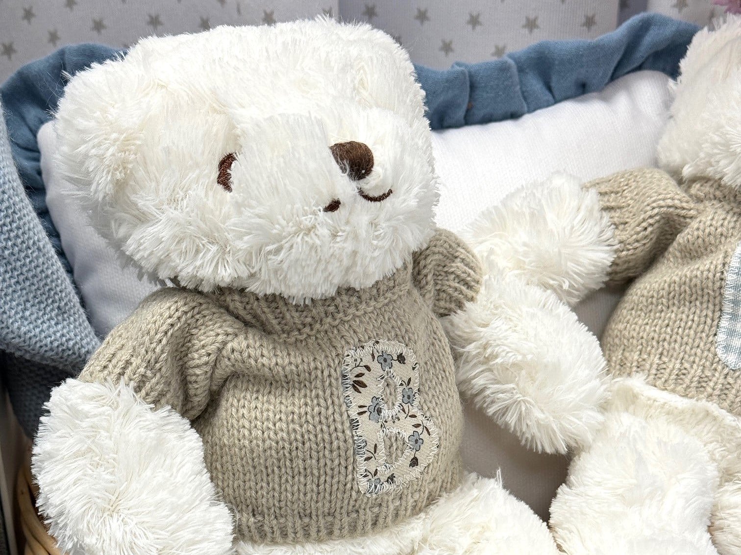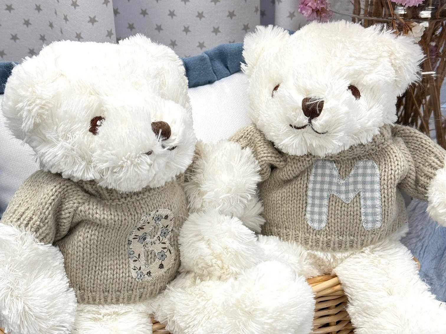 Osito con jersey personalizado con inicial tela. Se trata de un osito de peluche en color beige o en blanco muy suave.