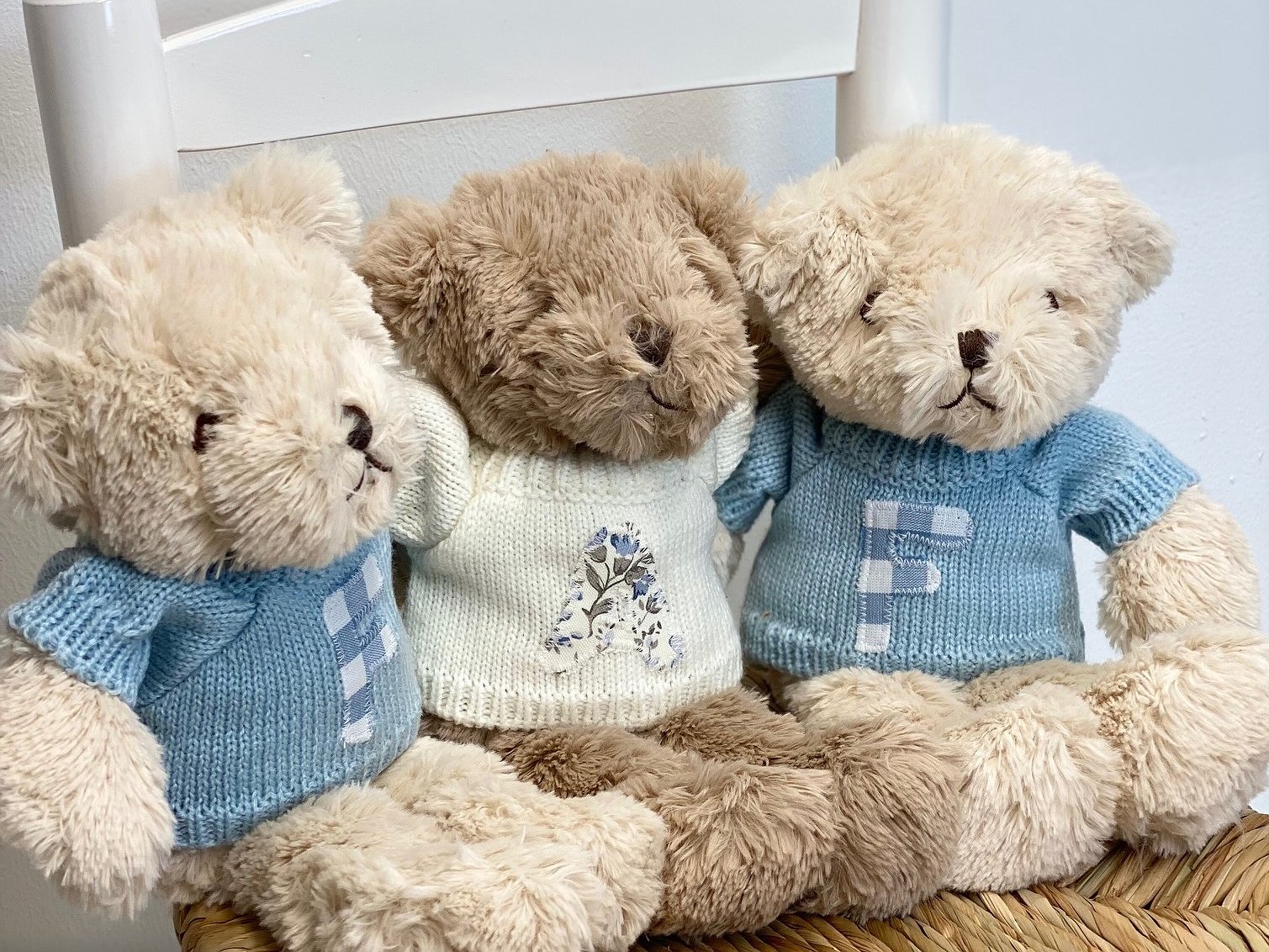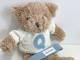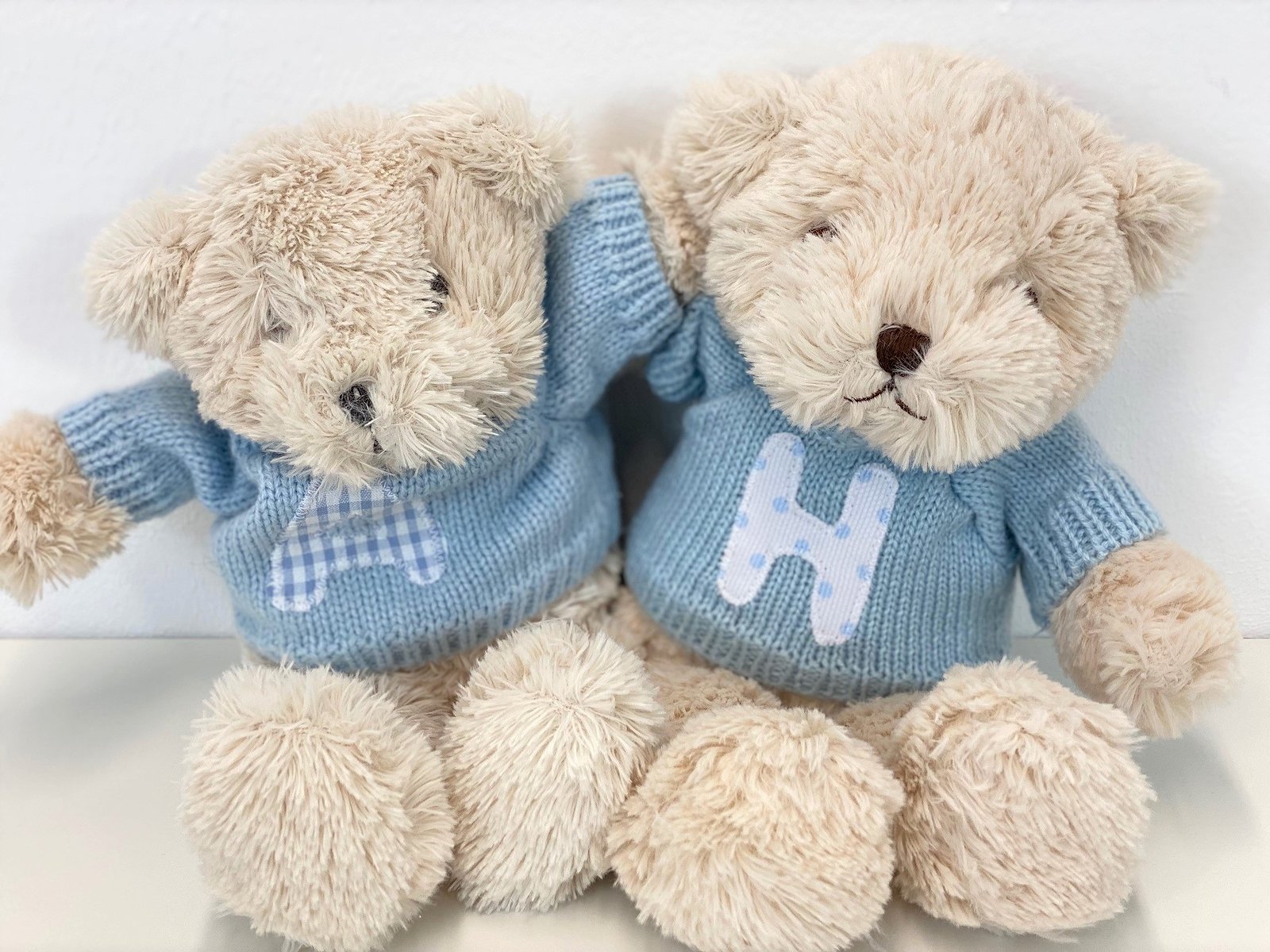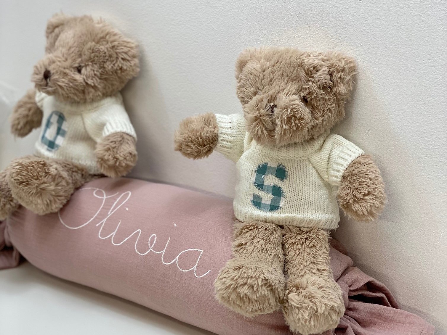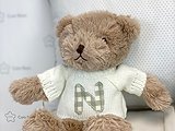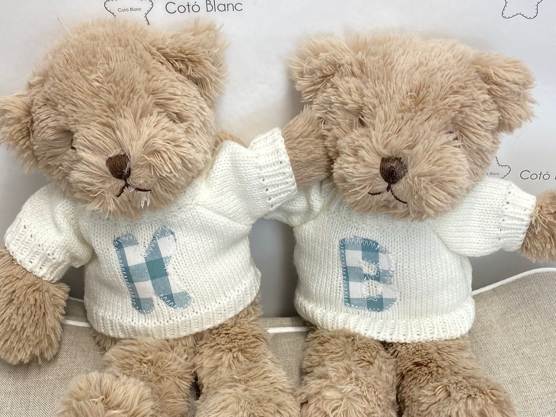 Osito con jersey personalizado con inicial tela. Se trata de un osito de peluche en color beige o en blanco muy suave.