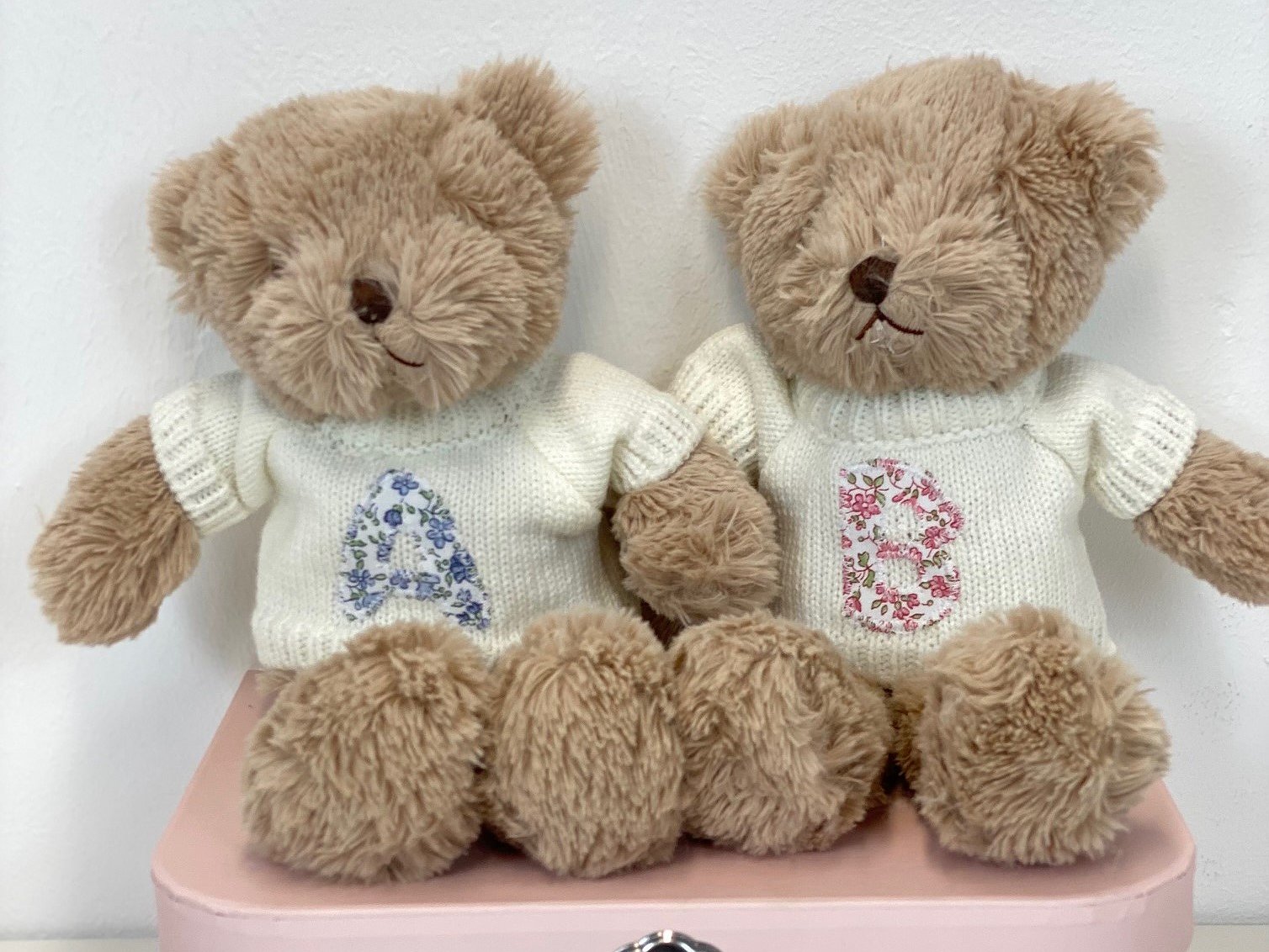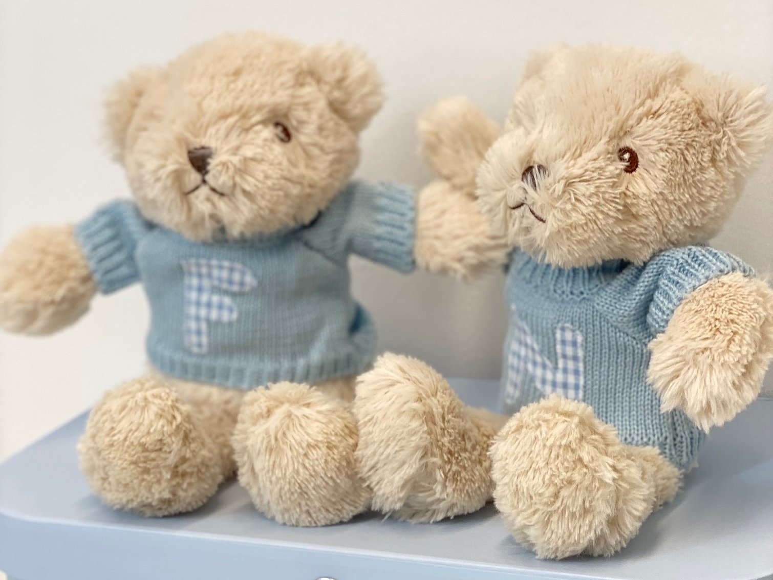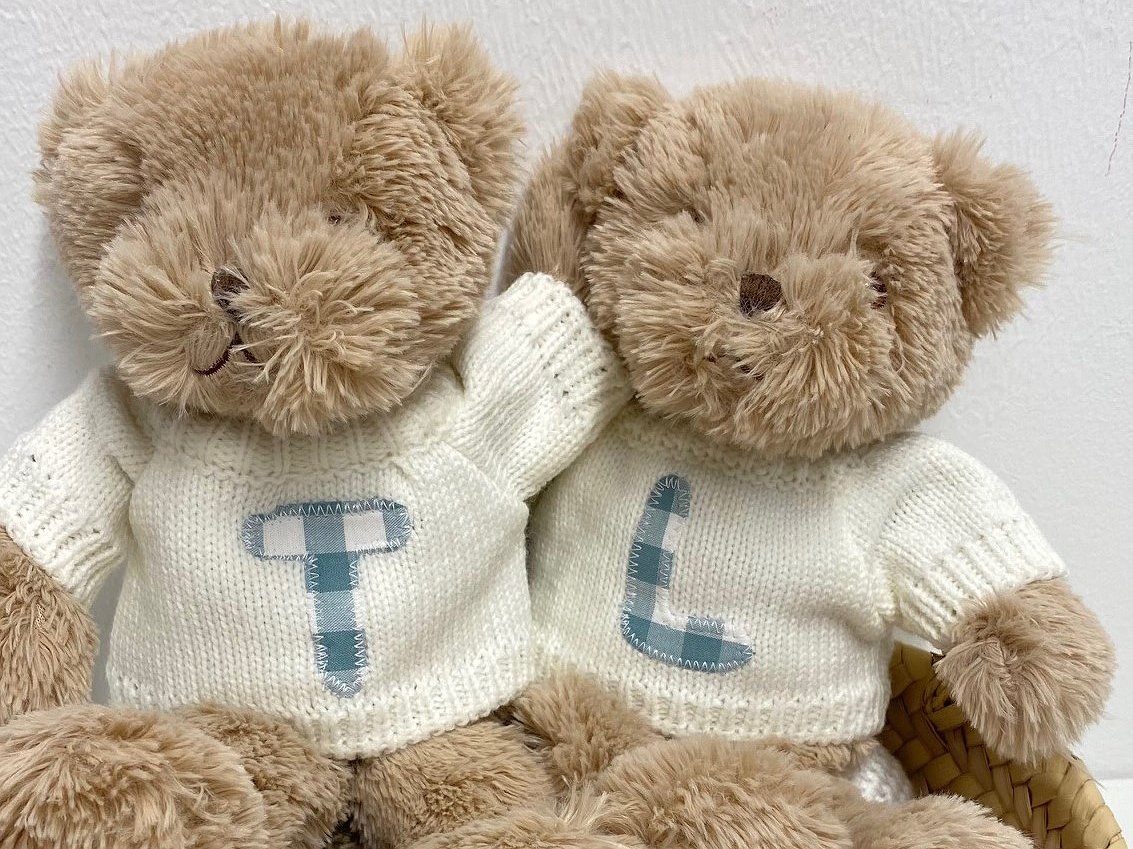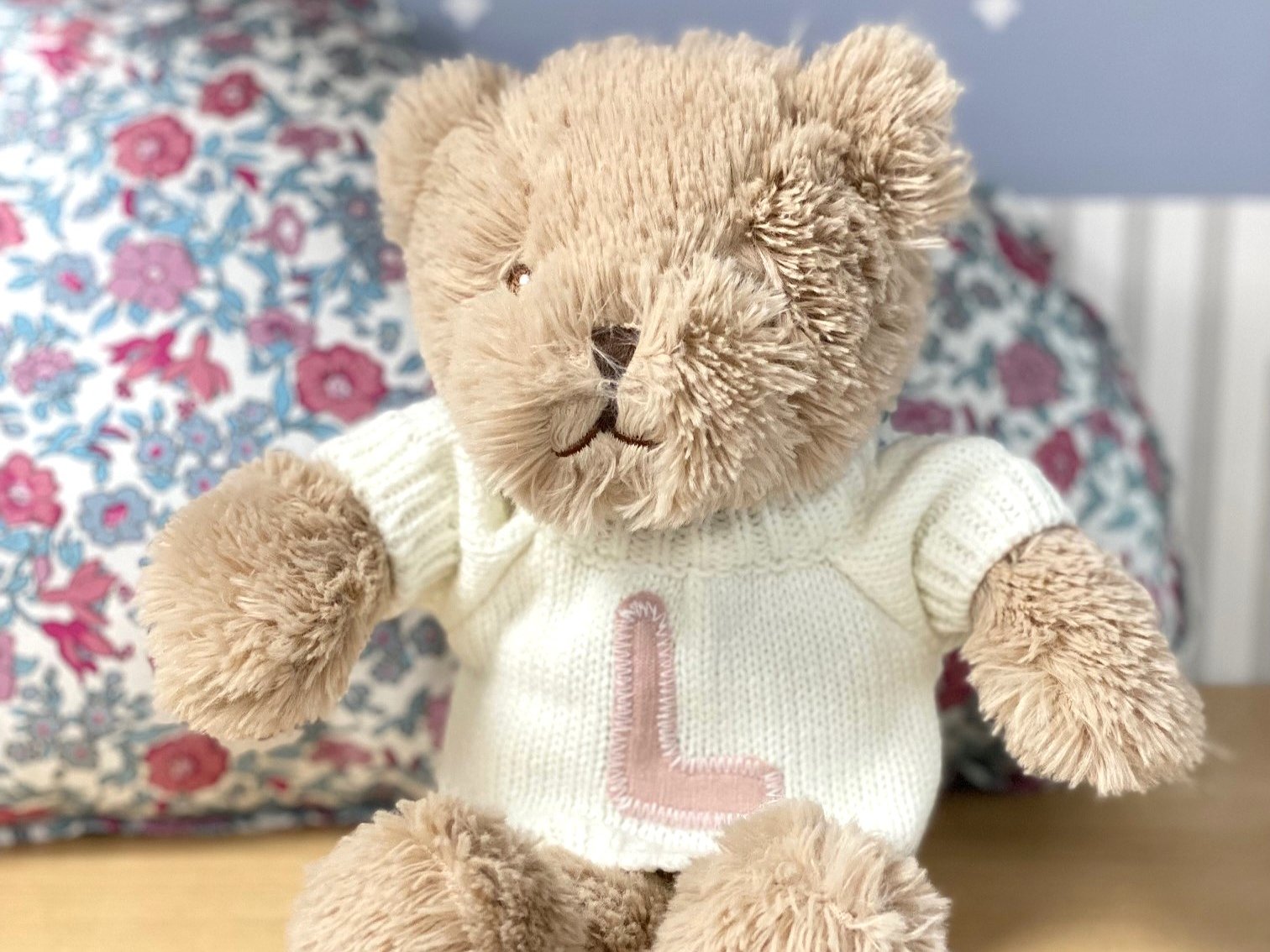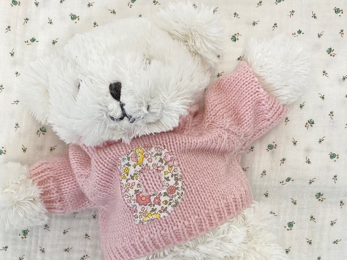 Osito con jersey personalizado con inicial tela. Se trata de un osito de peluche en color beige o en blanco muy suave.