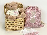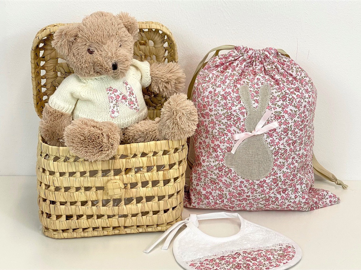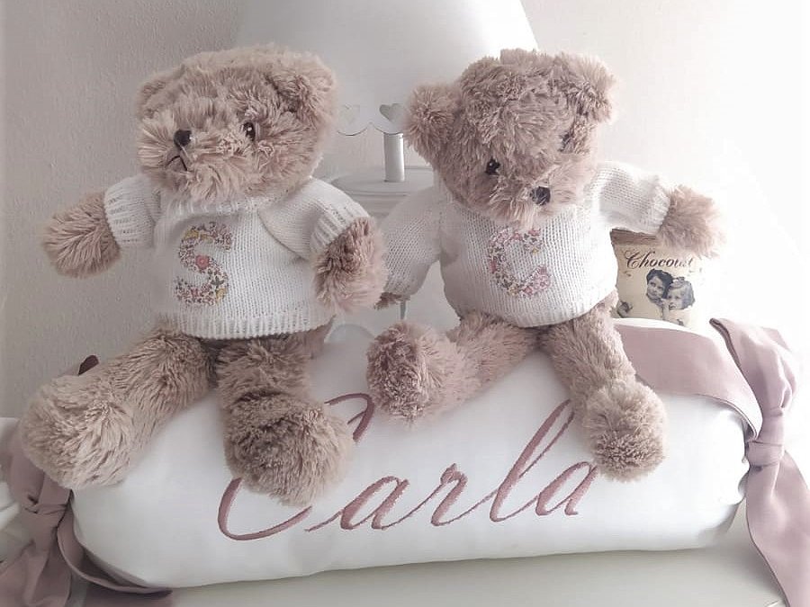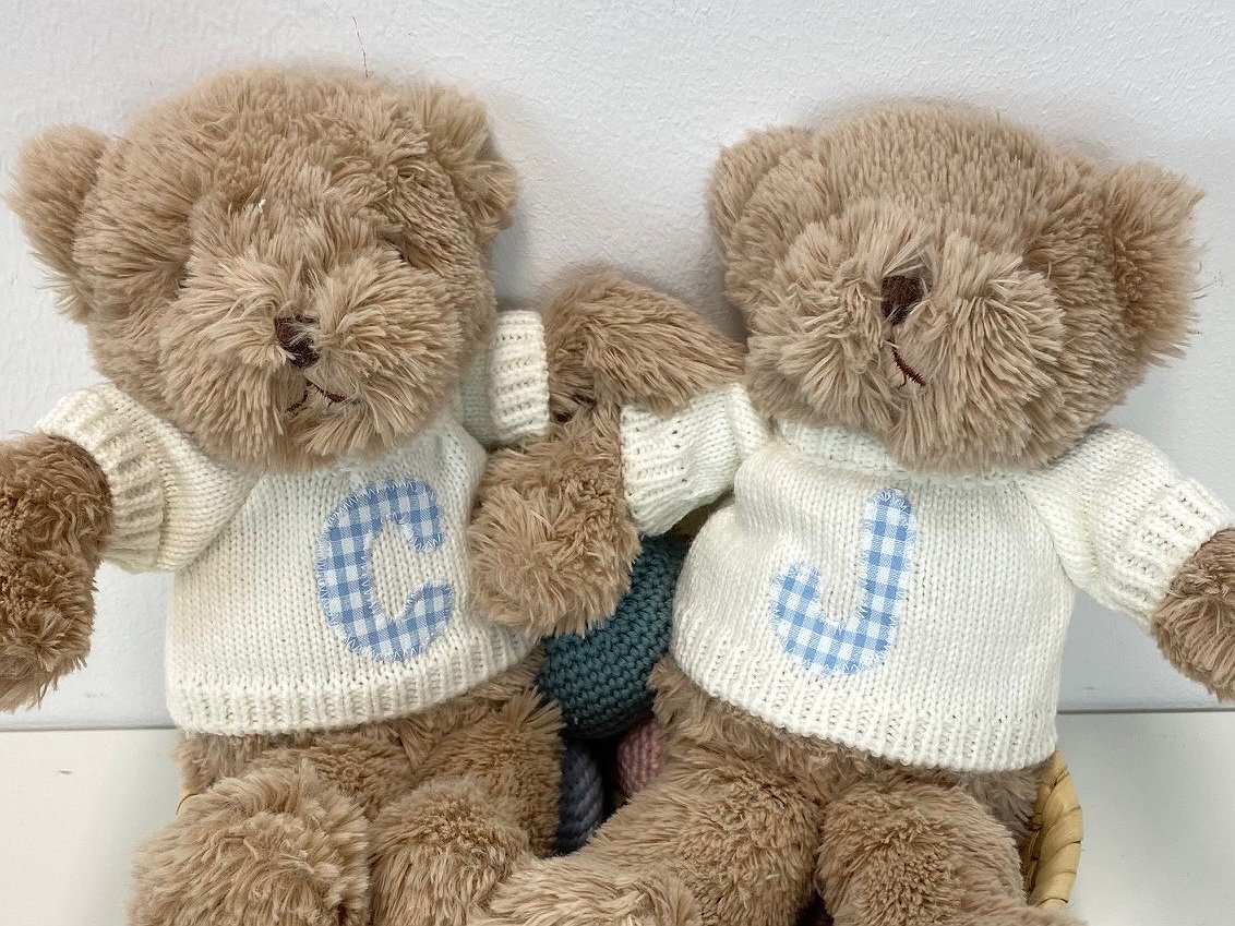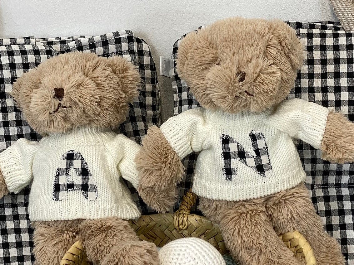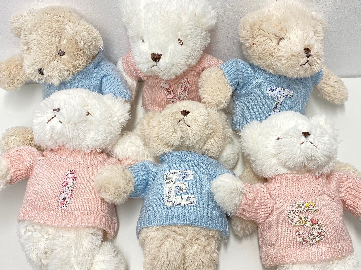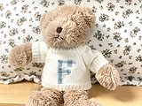 Osito con jersey personalizado con inicial tela. Se trata de un osito de peluche en color beige o en blanco muy suave.