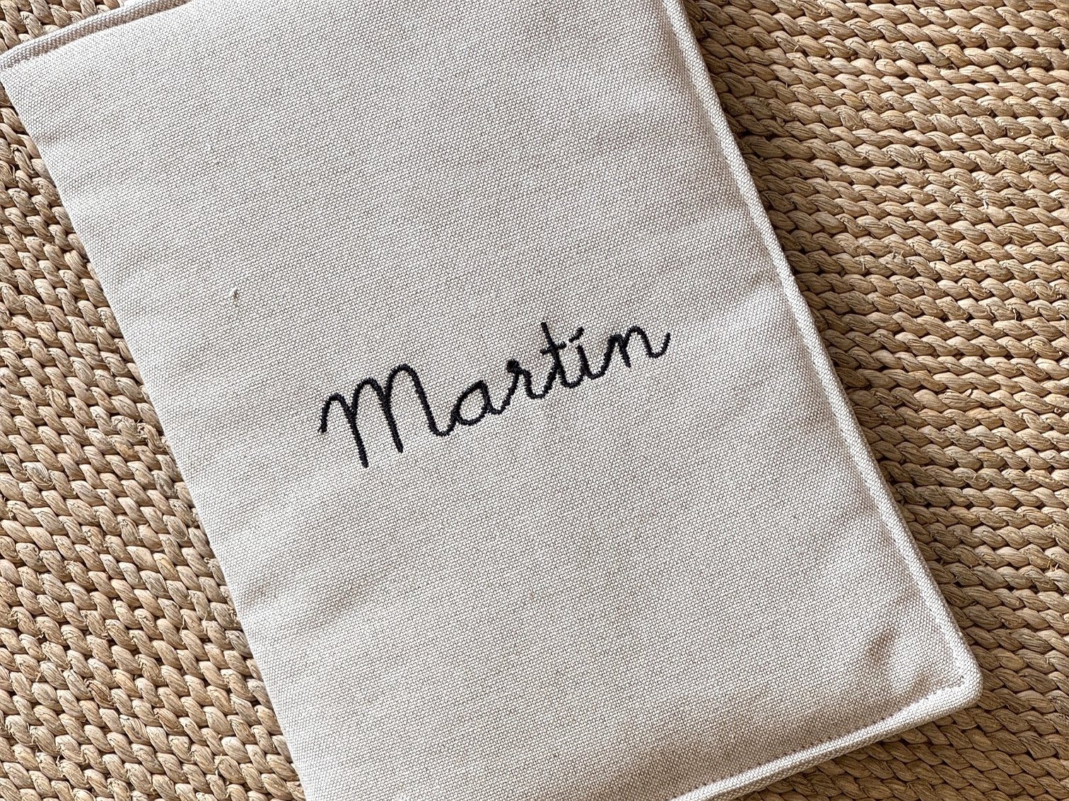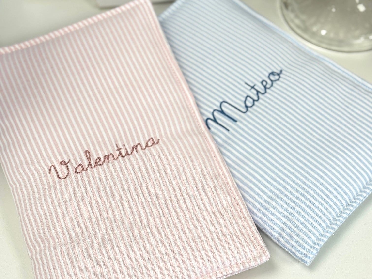 Portadocumentos con nombre bordado en letra escolar para bebé de tela para que puedas llevar bien ordenado todos los documentos relacionados con los médicos, tarjeta sanitaria, recetas, historial médico.