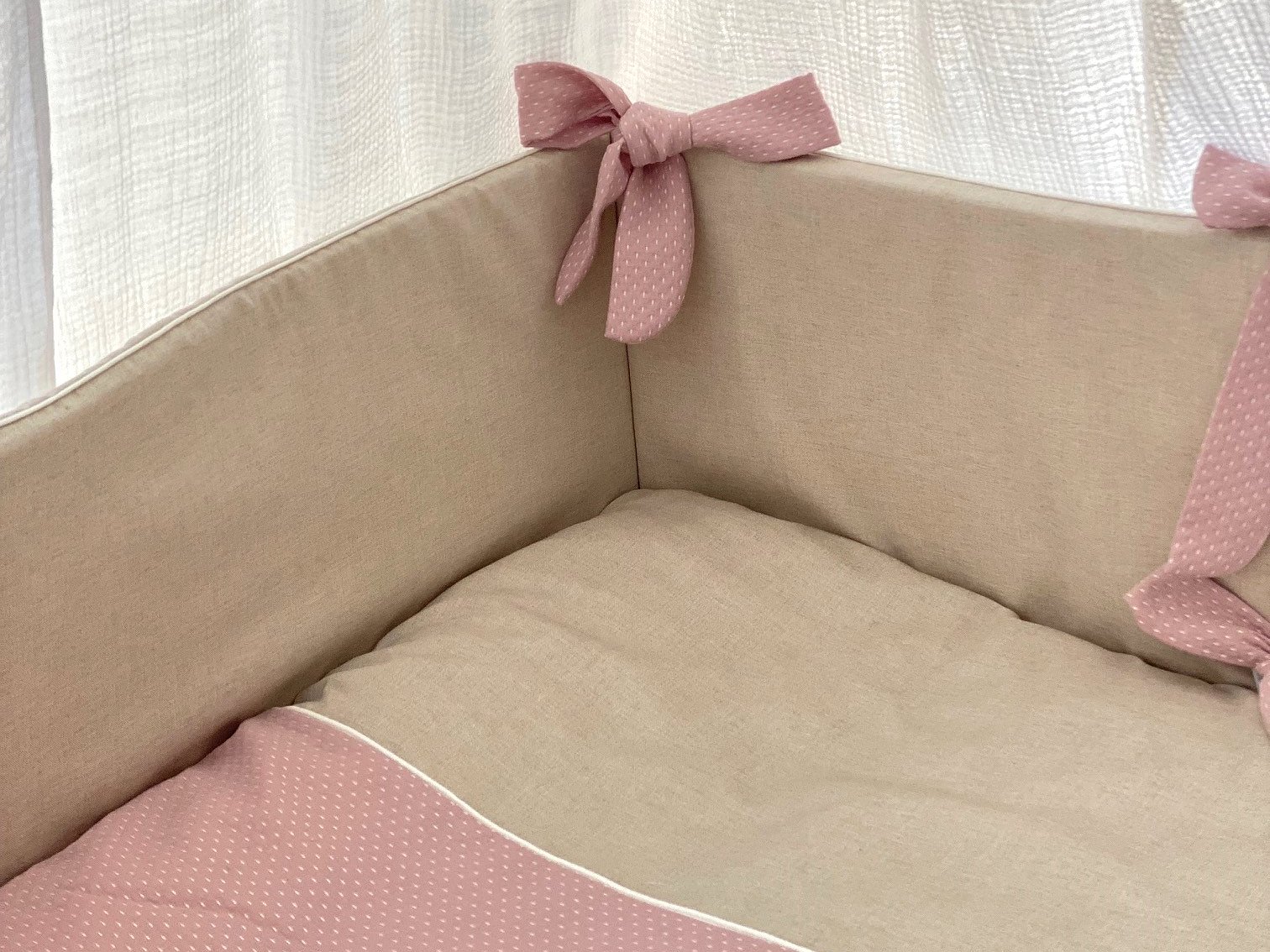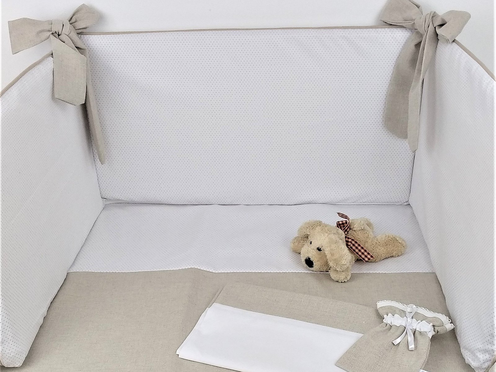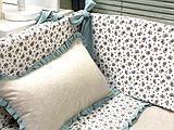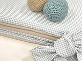 Consideramos que no es muy recomendable hacer el protector de cuna todo COMPLETO, porque el niño no debe sentirse metido en una caja, querrá levantarse porque no ve nada. Si tienes un niño más movido y así lo consideras oportuno tú, puedes pedirnos protector completo. Así elige la medida de la cuna, el color del cordoncillo, una tela para los protectores de entre todas las que te proponemos y otra para los lazos .