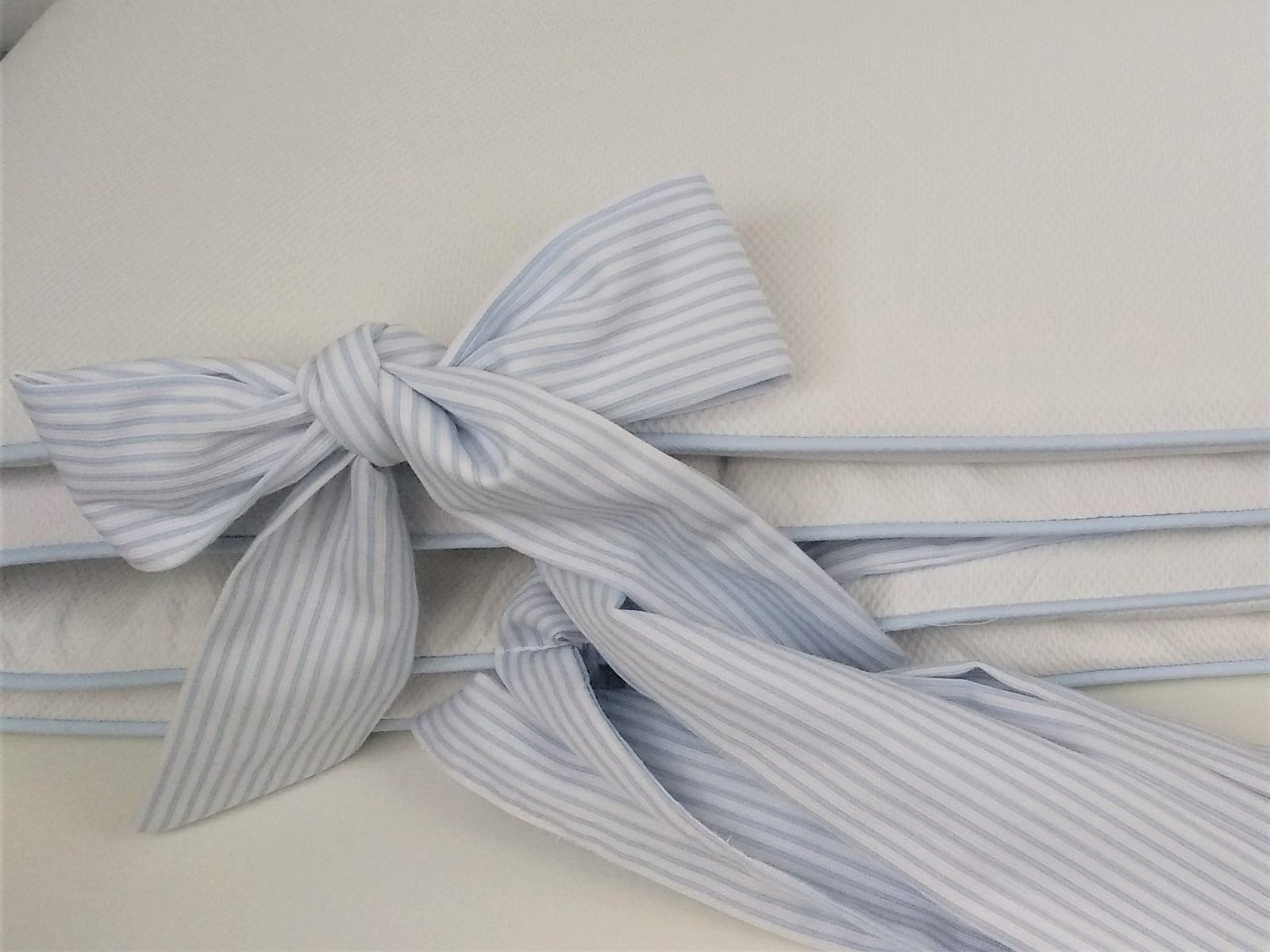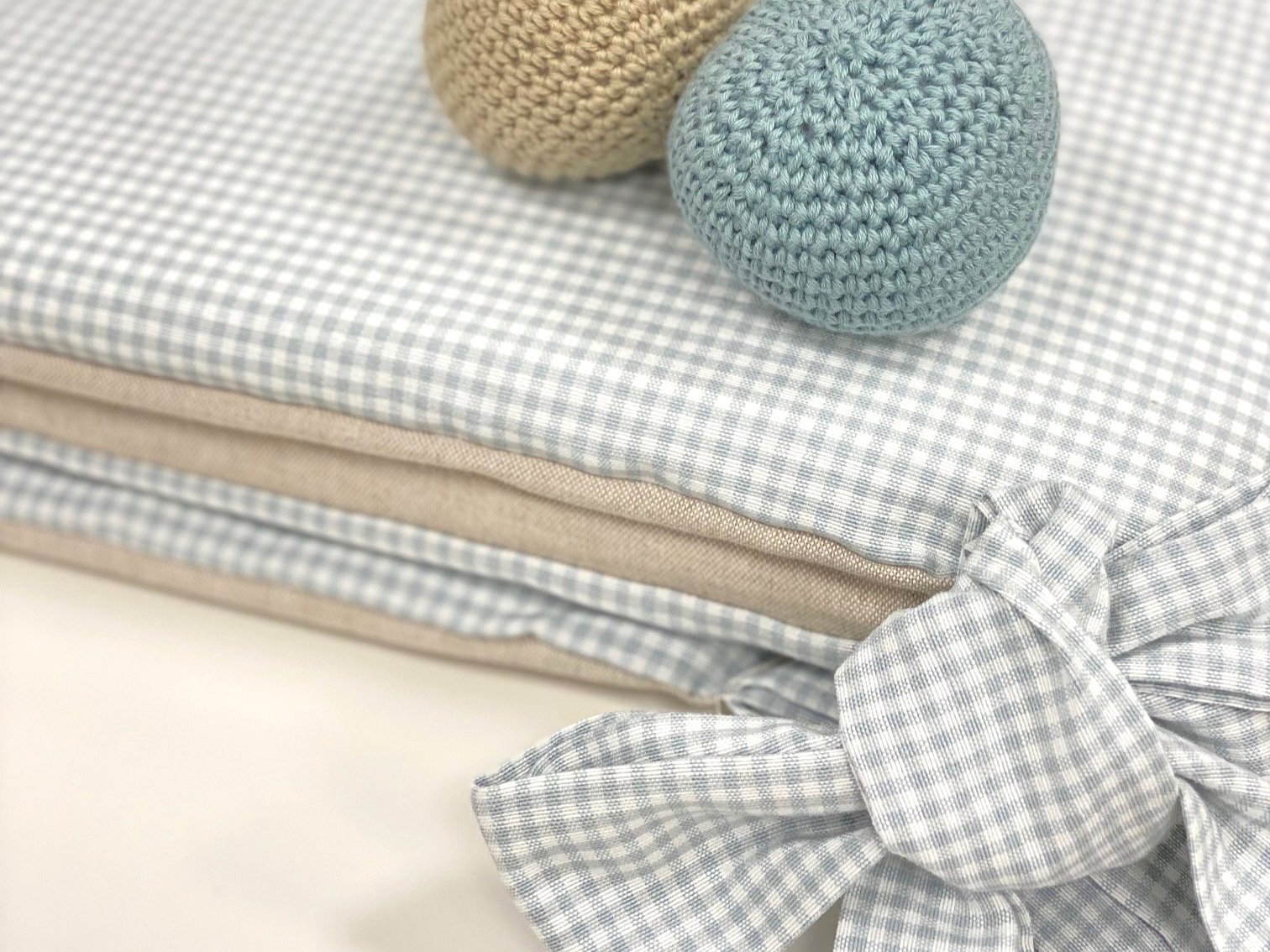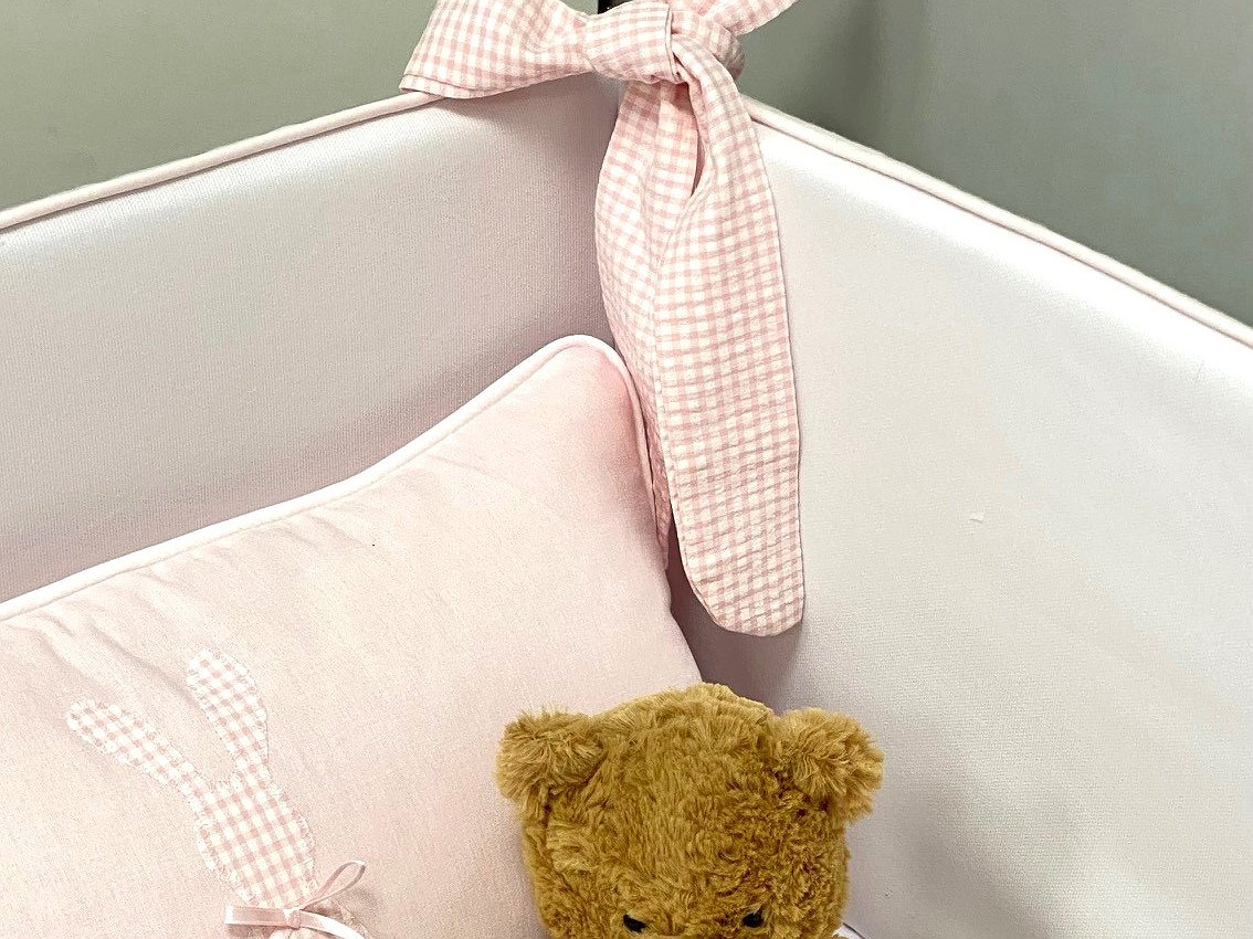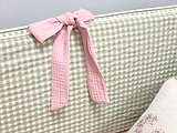 Protector de cuna personalizado y totalmente desenfundable, lo que te permite lavarlos en cualquier momento de forma fácil. Los rellenos de la funda están plastificados para evitar su empape y son de 2cm de grosor, así evitamos que se estropee el relleno y amortigua los golpecitos. Los lazos van incluidos y tienen un tamaño mediano.