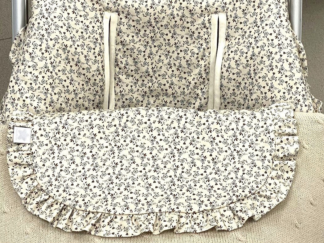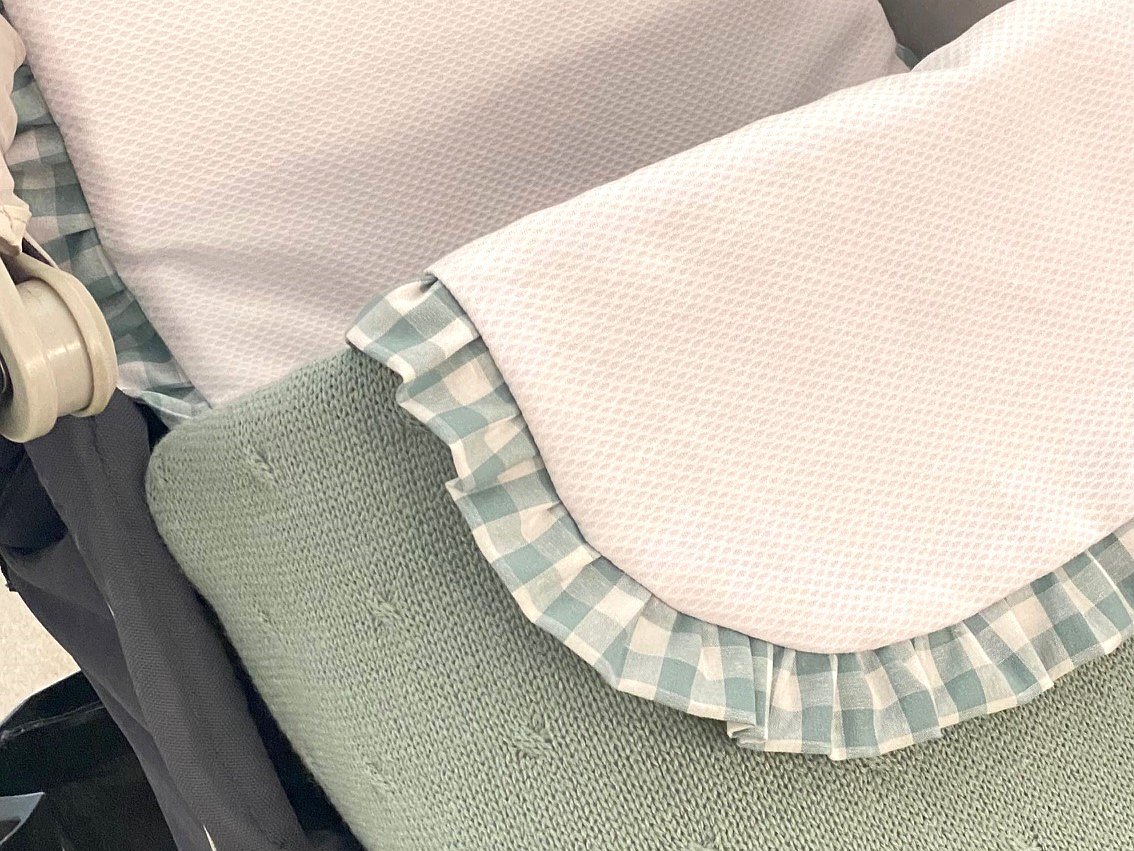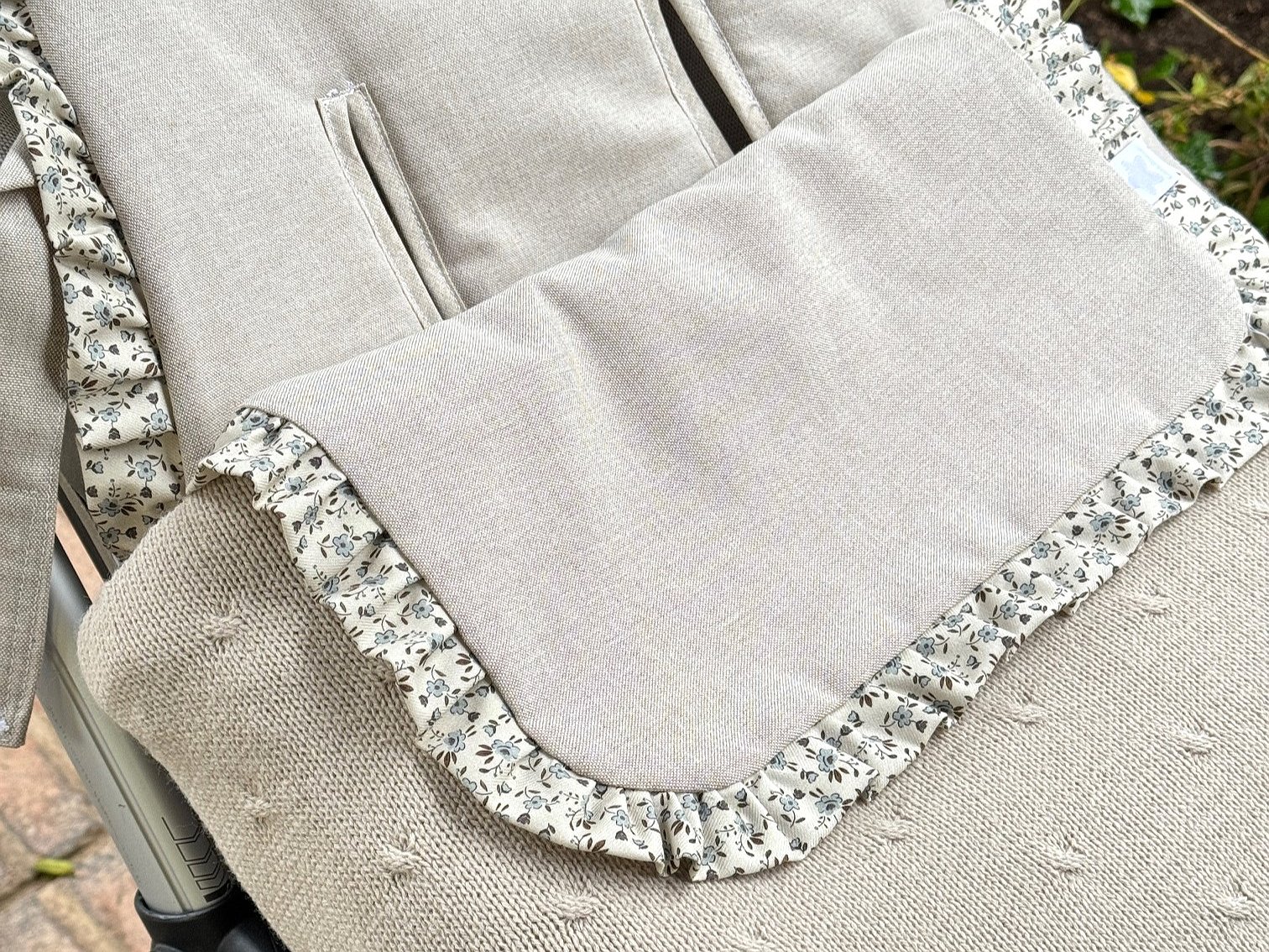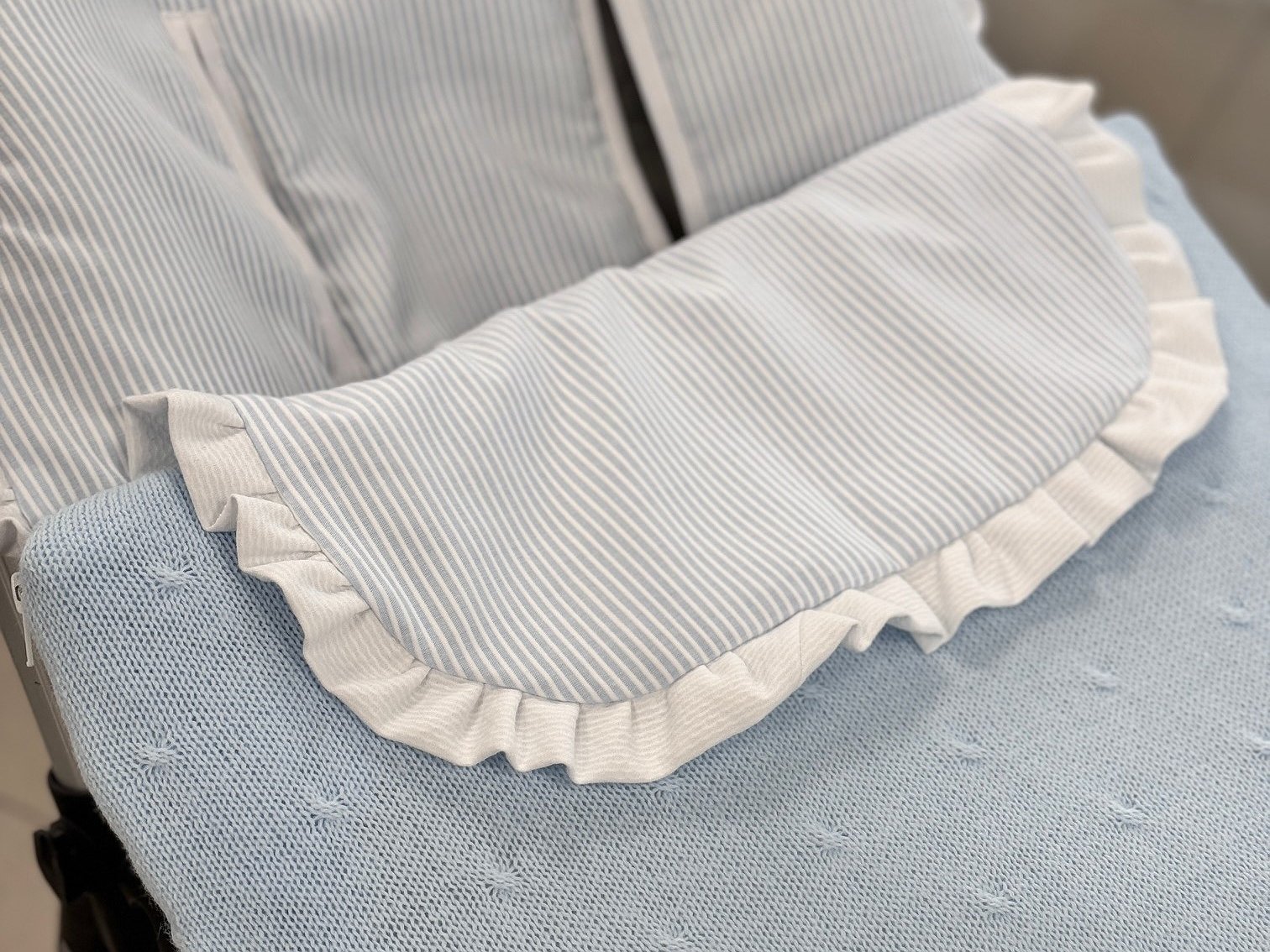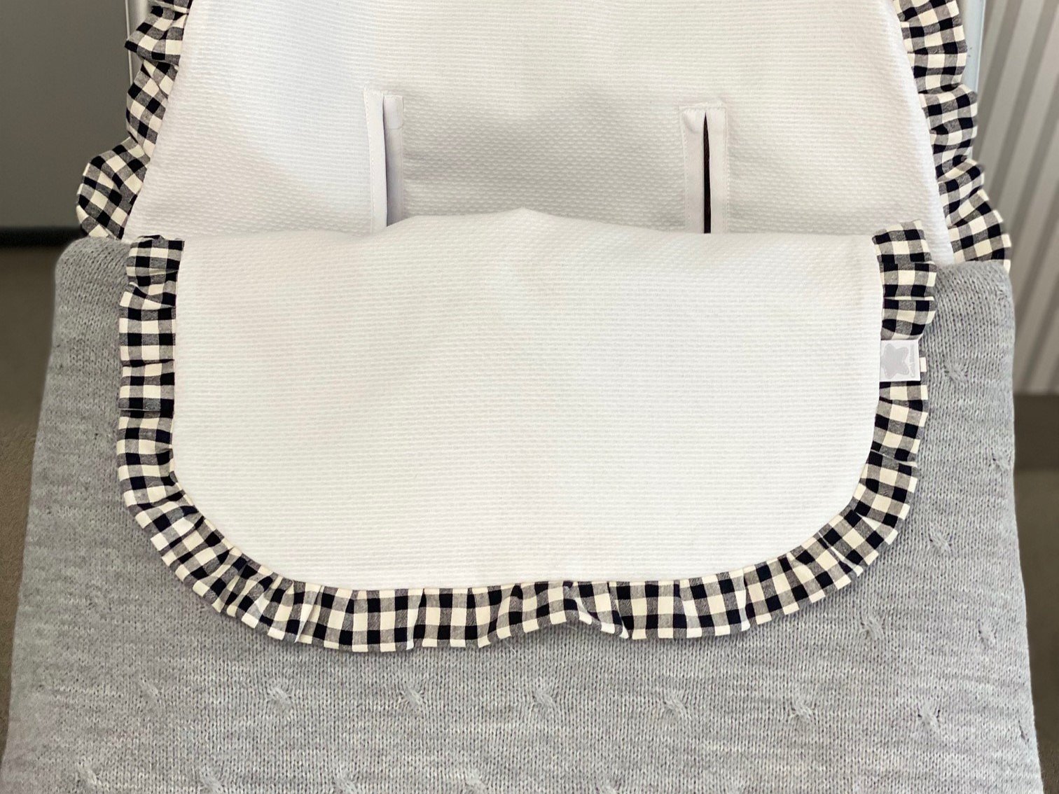 Saco para silla de paseo con volantes y lana en el exterior. Un diseño que se adapta a distintos modelos de cochecito: Bugaboo Camaleón, Bugaboo Fox, Bugaboo Bee, Bugaboo Donkey, Bugaboo Frog, Bugaboo Bufalo, Maclaren, Maxicosi, universal, yoyo, Joolz Hub, Cybex Pryam... Contacta para otras marcas.