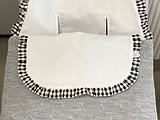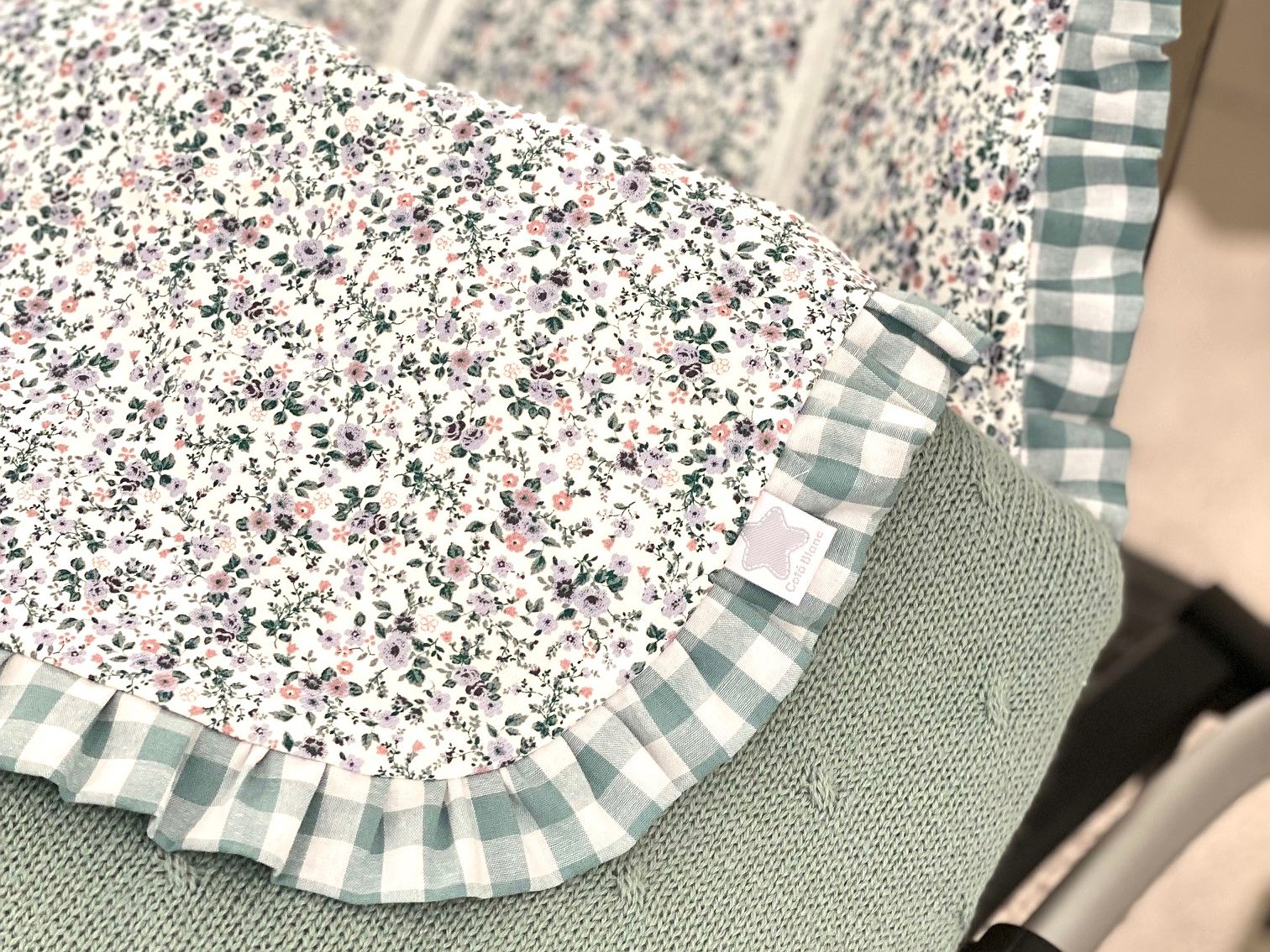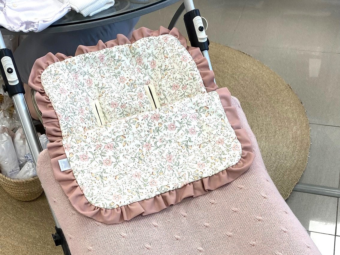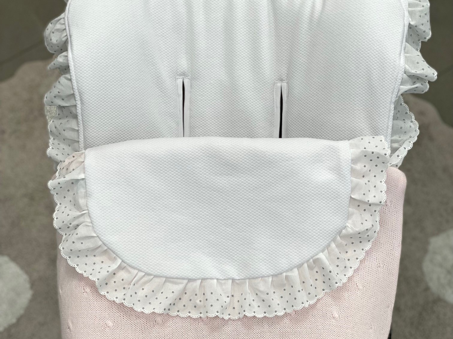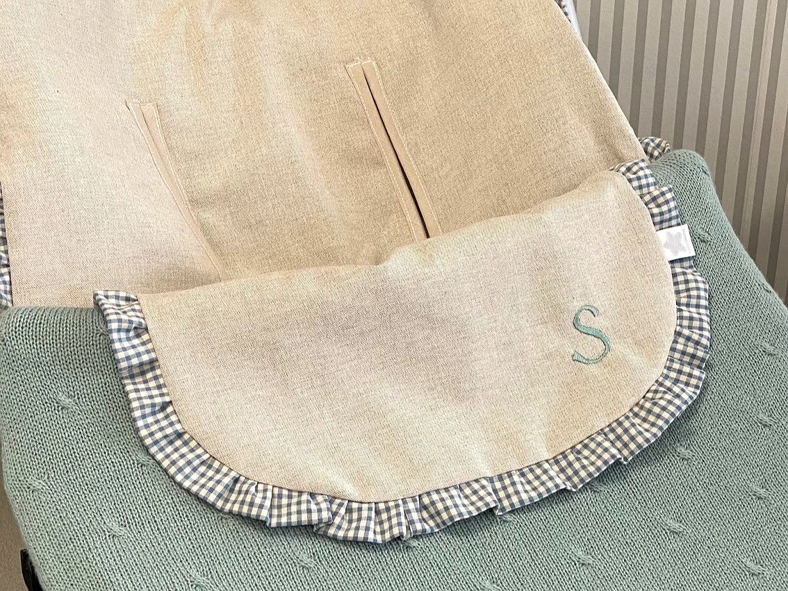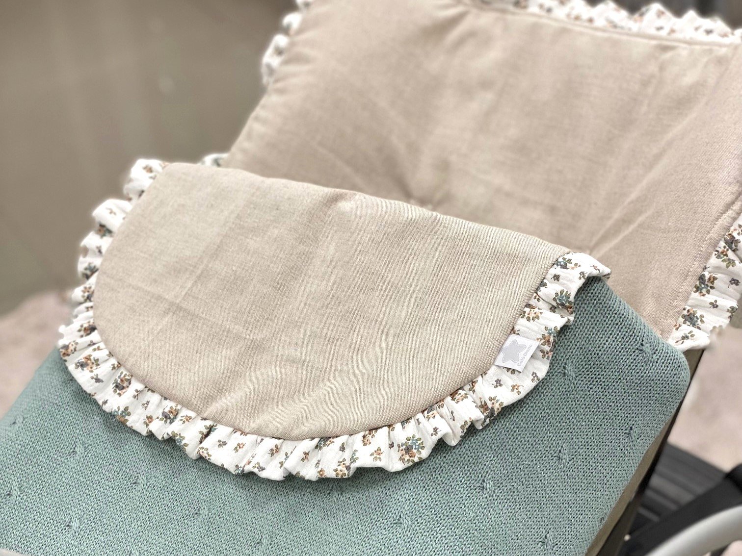 Saco para silla de paseo con volantes y lana en el exterior. Un diseño que se adapta a distintos modelos de cochecito: Bugaboo Camaleón, Bugaboo Fox, Bugaboo Bee, Bugaboo Donkey, Bugaboo Frog, Bugaboo Bufalo, Maclaren, Maxicosi, universal, yoyo, Joolz Hub, Cybex Pryam... Contacta para otras marcas.