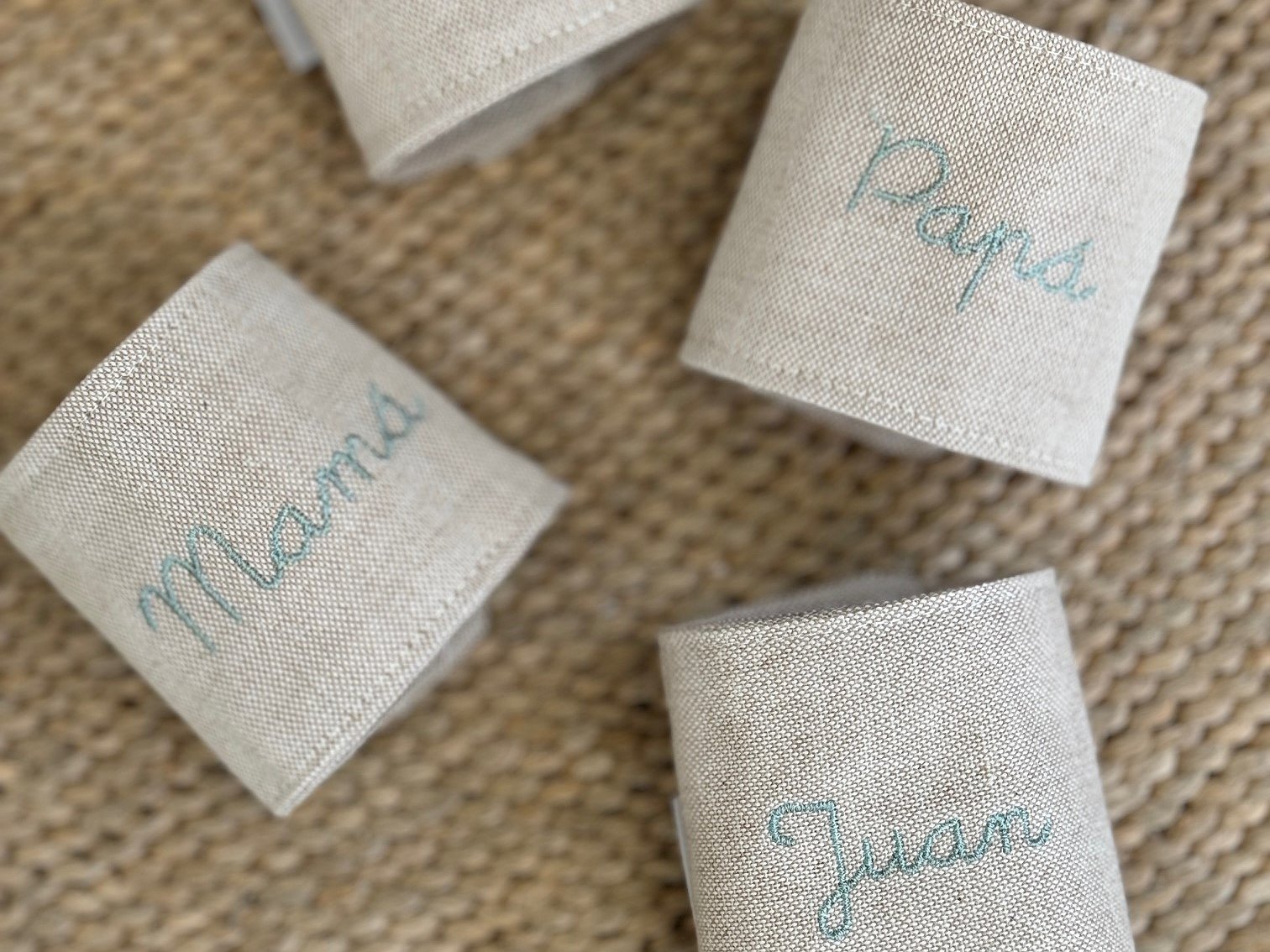 Se trata de unos porta servilletas en tela con cierre en velcro y nombre bordado en el tono que te guste.