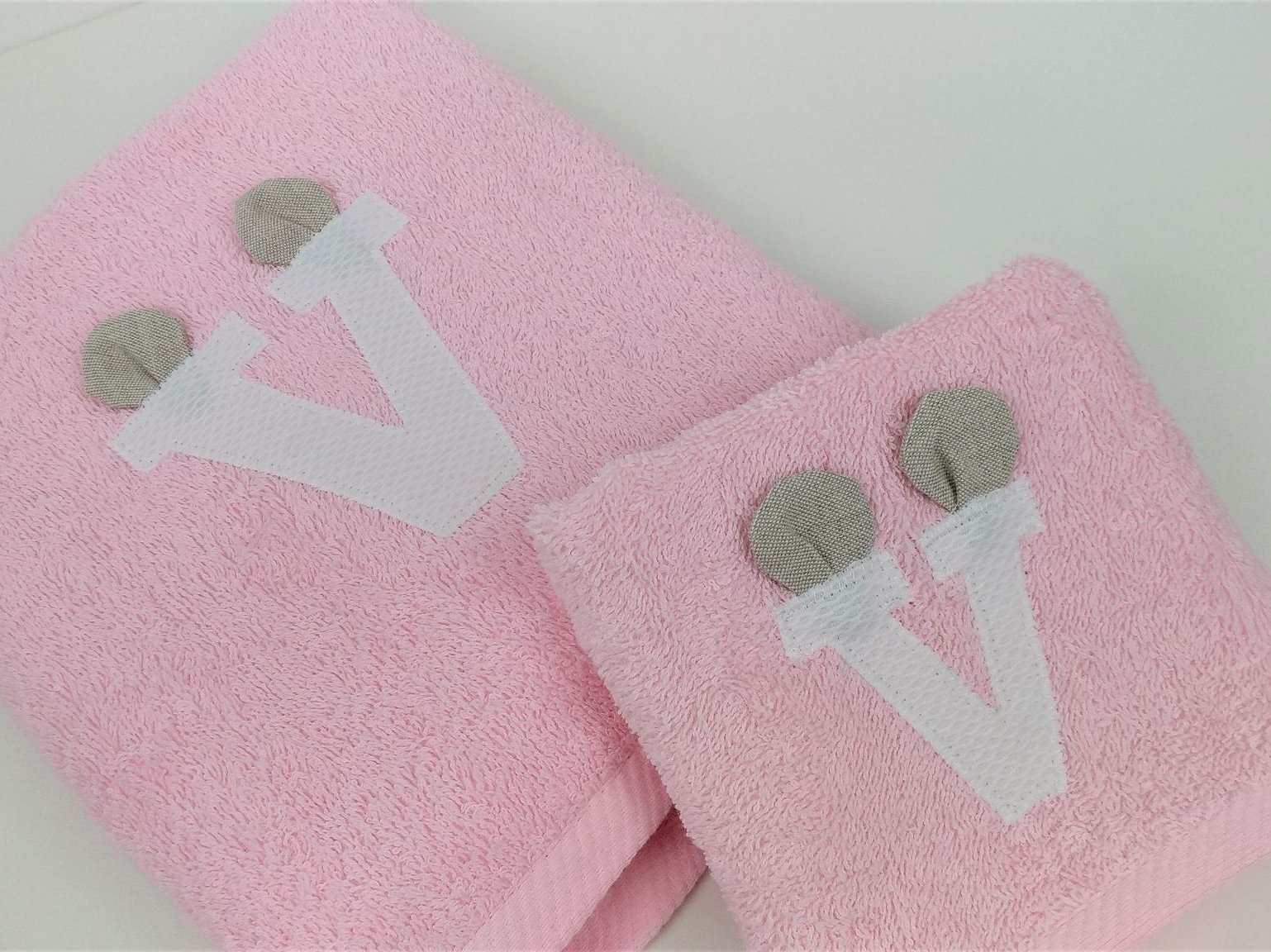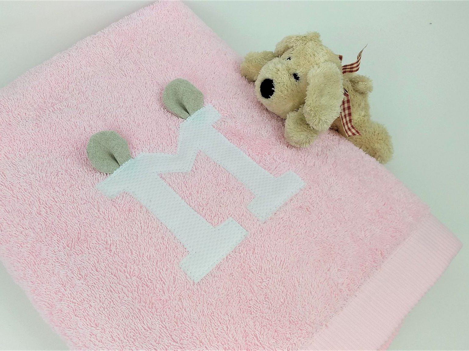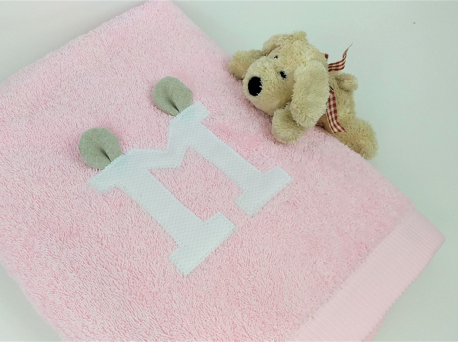 Toalla modelo Alicia con inicial y orejitas es un diseño personalizado con un toque muy divertido.